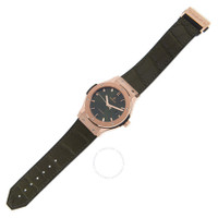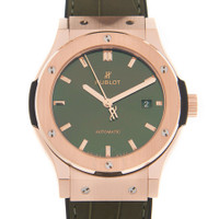 18kt rose gold case with a green leather/rubber strap. Fixed 18kt rose gold bezel. Green sunray dial with gold-tone hands and index hour markers. Dial Type: Analog. Date display at the 3 o'clock position. Hublot Calibre HUB1110 Automatic movement, based upon Sellita SW300-1, containing 21 Jewels, composed of 63 parts, bitting at 28800 vph, and has a power reserve of approximately 42 hours. Scratch resistant sapphire crystal. Pull / push crown. Transparent case back. Round case shape, case size: 42 mm. Deployment clasp. Water resistant at 50 meters / 165 feet. Functions: date, hour, minute, second. Classic Fusion Series. Luxury watch style. Watch label: Swiss Made. Hublot Classic Fusion Automatic Men's Watch 542.OX.8980.LR. GENERAL Box Type: Original Box CASE Case Size: 42 Case Material: 18kt Rose Gold Case Shape: Round Case Back: Transparent BAND Band Material: Leather/Rubber Band Type: Strap Band Color: Green Clasp: Deployment DIAL Dial Color: Green Sunray Type: Analog Crystal: Scratch Resistant Sapphire Hands: Gold-tone Dial Markers: Index Bezel: Fixed Bezel Material: 18kt Rose Gold Crown: Pull / Push INFORMATION Brand: Hublot Series: Classic Fusion Collection Name: Classic Fusion Gender: Mens Model: 542.OX.8980.LR Watch Label: Swiss Made Movement: Automatic Engine: Hublot Calibre HUB1110 Power Reserve: 42 hours FEATURES Water Resistance: 50 meters / 165 feet Calendar: Date display at the 3 o'clock position Functions: Date, Hour, Minute, Second Watch Features: Analog, Gold, Leather, Rubber ADDITIONAL INFO Watch Style: Luxury Warranty: 2 Year Jomashop Warranty Jomashop Sku: HB542OX8980LR Department: Watches Category: Watches