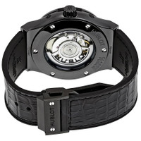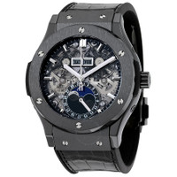 Black ceramic case with a black rubber strap with a stiched black (alligator) leather top. Fixed black ceramic bezel. Skeleton dial with luminous silver-tone hands and index hour markers. Minute markers around the outer rim. Dial Type: Analog. Day of the week and month display above the center dial. Three sub-dials displaying: month, day of the week and date / moonphase. Hublot calibre HUB1131 automatic movement, containing 25 Jewels, composed of 134 parts, bitting at 28800 vph, and has a power reserve of approximately 42 hours. Scratch resistant sapphire crystal. Pull / push crown. Transparent case back. Round case shape. Case size: 45 mm. Band width: 25 mm. Deployment clasp. Water resistant at 50 meters / 165 feet. Functions: moon phase, month, date, day, hour, minute, second. Classic Fusion Aerofusion Series. Luxury watch style. Watch label: Swiss Made. Hublot Classic Fusion Automatic Skeleton Dial Men's Watch 517.CX.0170.LR. INFORMATION Brand: Hublot Series: Classic Fusion Aerofusion Collection Name: Classic Fusion Aerofusion Gender: Mens Model: 517.CX.0170.LR Watch Label: Swiss Made Movement: Automatic Engine: Hublot Calibre HUB1131 Power Reserve: 42 hours CASE Case Size: 45 mm Case Material: Ceramic Case Shape: Round Case Back: Transparent BAND Band Material: Rubber with a Black (Alligator) Leather Top Band Type: Strap Band Color: Black Band Width: 25 mm Clasp: Deployment DIAL Dial Color: Skeleton Type: Analog Crystal: Scratch Resistant Sapphire Hands: Luminous Silver-tone Dial Markers: Index Second Markers: Minute Markers around the outer rim Sub Dials: Three - Month, Day of the Week and Date / Moonphase Bezel: Fixed Bezel Color: Black Bezel Material: Ceramic Crown: Pull / Push FEATURES Water Resistance: 50 meters / 165 feet Calendar: Day of the Week and Month display above the center dial Functions: Moon Phase, Month, Date, Day, Hour, Minute, Second Watch Features: Alligator Leather, Analog, Month, Ceramic, Leather, Rubber, Moon Phase ADDITIONAL INFO Watch Style: Luxury Warranty: 2 Year Jomashop Warranty Jomashop Sku: HB517CX0170LR Department: Watches Category: Watches