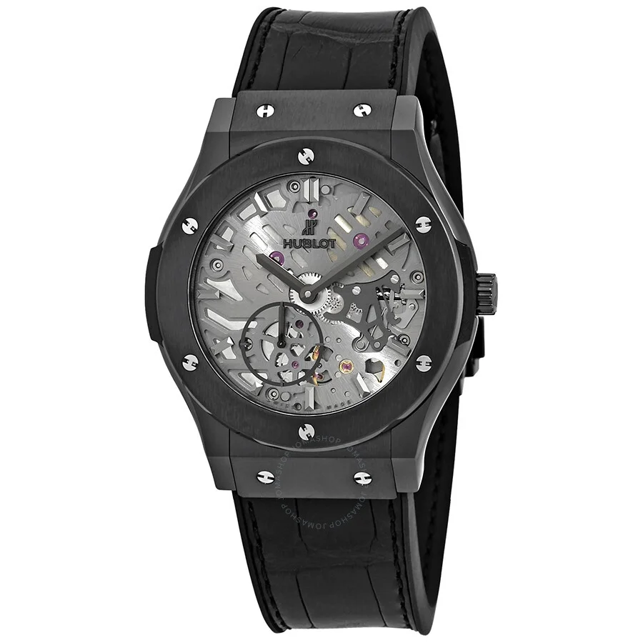 Black ceramic case with a black (alligator) leather (rubber backed) strap. Fixed black ceramic bezel. Skeleton dial with gray hands and index hour markers. Dial Type: Analog. 60 seconds sub-dial at the 7 o'clock positions. Automatic movement with a 42-hour power reserve. Scratch resistant sapphire crystal. Pull / push crown. Transparent case back. Round case shape. Case size: 42 mm. Push button release clasp. Water resistant at 50 meters / 165 feet. Functions: hour, minute, second. Luxury watch style. Watch label: Swiss Made. Item Variations: 545 CM 0140 LR, 545-CM-0140-LR, 545/CM/0140/LR, 545CM0140LR. Hublot Classic Fusion Automatic Skeleton Dial Men's Watch 545.CM.0140.LR. CASE Case Size: 42 Case Material: Ceramic Case Shape: Round Case Back: Transparent BAND Band Material: (Alligator) Leather (Rubber Backed) Band Type: Strap Band Color: Black Clasp: Push Button Release DIAL Dial Color: Skeleton Type: Analog Crystal: Scratch Resistant Sapphire Hands: Gray Dial Markers: Index Sub Dials: One - Small Second Bezel: Fixed Bezel Color: Black Bezel Material: Ceramic Crown: Pull / Push INFORMATION Brand: Hublot Series: Classic Fusion Collection Name: Classic Fusion Gender: Mens Model: 545.CM.0140.LR Watch Label: Swiss Made Movement: Automatic Power Reserve: 42 hours FEATURES Water Resistance: 50 meters / 165 feet Functions: Hour, Minute, Second Watch Features: Ceramic, Leather, Rubber ADDITIONAL INFO Watch Style: Luxury Warranty: 2 Year Jomashop Warranty Jomashop Sku: HB545CM0140LR Item Variation: 545 CM 0140 LR, 545-CM-0140-LR, 545/CM/0140/LR, 545CM0140LR Department: Watches Category: Watches