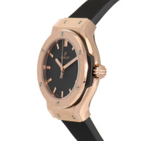18 carat rose gold case with a black rubber strap. Fixed bezel. Black dial with rose gold-tone hands and index hour markers. Dial Type: Analog. Date display at the 3 o'clock position. Quartz movement. Caliber hub2912 engine. Scratch resistant sapphire crystal. Solid case back. Case diameter: 33 mm. Round case shape. Water resistant at 50 meters / 165 feet. Functions: date, hour, minute, second. Luxury watch style. Watch label: Swiss Made. Hublot Classic Fusion Black Dial Ladies 18 Carat Rose Gold Watch 581.OX.1181.RX. GENERAL Box Type: Original Box CASE Case Diameter: 33 mm Case Material: 18kt Rose Gold Case Shape: Round Case Back: Solid BAND Band Material: Rubber Band Type: Strap Band Color: Black DIAL Dial Color: Black Type: Analog Crystal: Scratch Resistant Sapphire Hands: Rose Gold-tone Dial Markers: Index Bezel: Fixed Bezel Material: 18kt Rose Gold INFORMATION Brand: Hublot Series: Classic Fusion Collection Name: Classic Fusion Gender: Womens Model: 581.OX.1181.RX Watch Label: Swiss Made Movement: Quartz Engine: Hublot Calibre HUB2912 FEATURES Water Resistance: 50 meters / 165 feet Calendar: Date display at the 3 o'clock position Functions: Date, Hour, Minute, Second Watch Features: Analog, Gold, Rubber ADDITIONAL INFO Watch Style: Luxury Warranty: 2 Year Jomashop Warranty Jomashop Sku: HB581OX1181RX Department: Watches Category: Watches