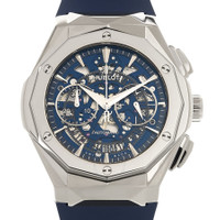 Grey titanium case with a blue rubber strap. Fixed grey titanium bezel. Blue (cut-out) dial with silver-tone hands and index hour markers. Minute markers around the outer rim. Dial Type: Analog. Date display at the 6 o'clock position. Chronograph - two sub-dials displaying: 60 second and 30 minute. Hublot calibre HUB1155 automatic movement, based upon ETA 2892, containing 60 Jewels, composed of 207 parts, bitting at 28800 vph, and has a power reserve of approximately 42 hours. Scratch resistant sapphire crystal. Transparent see through case back. Round case shape. Case size: 45 mm. Deployment clasp with a push button release. Water resistant at 50 meters / 165 feet. Functions: chronograph, date, hour, minute, second. Additional Info: original box, international warranty card, manual (complete accessories). Classic Fusion Series. Luxury watch style. Watch label: Swiss Made. Hublot Classic Fusion Chronograph Automatic Men's Watch 525.NX.5170.RX.ORL21. GENERAL Box Type: Original Box CASE Case Size: 45 Case Material: Titanium Case Shape: Dodecagon Case Back: Transparent BAND Band Material: Rubber Band Type: Strap Band Color: Blue Clasp: Deployment with Push Button Release DIAL Dial Color: Blue (Cut Out) Type: Analog Crystal: Scratch Resistant Sapphire Hands: Silver-tone Dial Markers: Index Second Markers: Minute Markers around the outer rim Sub Dials: Two - 60 Second and 30 Minute Bezel: Fixed Bezel Color: Grey Bezel Material: Titanium INFORMATION Brand: Hublot Series: Classic Fusion Collection Name: Classic Fusion Gender: Mens Model: 525.NX.5170.RX.ORL21 Watch Label: Swiss Made Movement: Automatic Engine: Hublot Calibre HUB1155 Power Reserve: 42 hours FEATURES Water Resistance: 50 meters / 165 feet Calendar: Date display at the 6 o'clock position Functions: Chronograph, Date, Hour, Minute, Second Watch Features: Analog, Rubber, Titanium, Chronograph ADDITIONAL INFO Watch Style: Luxury Warranty: 2 Year Jomashop Warranty Additional Info: Original Box, Manual (Complete Accessories) Jomashop Sku: HB525NX5170RXORL21 Department: Watches Category: Watches