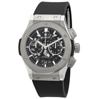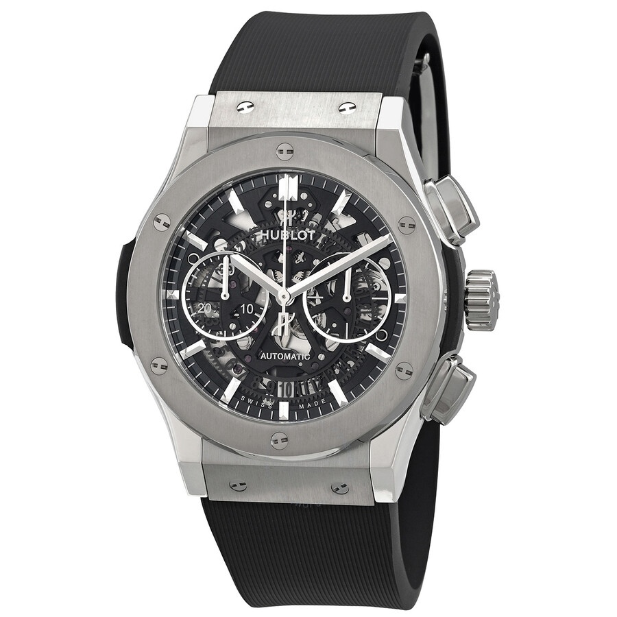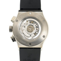 Grey titanium case with a black rubber strap. Fixed grey titanium bezel. Transparent dial with silver-tone hands and index hour markers. Minute markers around the outer rim. Dial Type: Analog. Chronograph - two sub-dials displaying: 60 second and 30 minute. Hublot Calibre HUB1155 Automatic movement, based upon ETA 2892, containing 60 Jewels, composed of 207 parts, bitting at 28800 vph, and has a power reserve of approximately 42 hours. Scratch resistant sapphire crystal. Transparent see through case back. Round case shape, case size: 45 mm. Deployment with push button release clasp. Water resistant at 50 meters / 165 feet. Functions: chronograph, date, hour, minute, second. Additional Info: original box, international warranty card, manual (complete accessories). Classic Fusion Series. Luxury watch style. Watch label: Swiss Made. Hublot Classic Fusion Chronograph Automatic Men's Watch 525.NX.0170.RX. GENERAL Box Type: Original Box CASE Case Size: 45 Case Material: Titanium Case Shape: Round Case Back: Transparent See Through BAND Band Material: Rubber Band Type: Strap Band Color: Black Clasp: Deployment with Push Button Release DIAL Dial Color: Transparent Type: Analog Crystal: Scratch Resistant Sapphire Hands: Silver-tone Dial Markers: Index Second Markers: Minute Markers around the outer rim Sub Dials: Two - 60 Second and 30 Minute Bezel: Fixed Bezel Color: Grey Bezel Material: Titanium INFORMATION Brand: Hublot Series: Classic Fusion Collection Name: Classic Fusion Gender: Mens Model: 525.NX.0170.RX Watch Label: Swiss Made Movement: Automatic Engine: Hublot Calibre HUB1155 Power Reserve: 42 hours FEATURES Water Resistance: 50 meters / 165 feet Functions: Chronograph, Date, Hour, Minute, Second Watch Features: Analog, Rubber, Titanium, Chronograph ADDITIONAL INFO Watch Style: Luxury Warranty: 2 Year Jomashop Warranty Additional Info: Original Box, International Warranty Card, Manual (Complete Accessories) Jomashop Sku: HB525NX0170RX Department: Watches Category: Watches