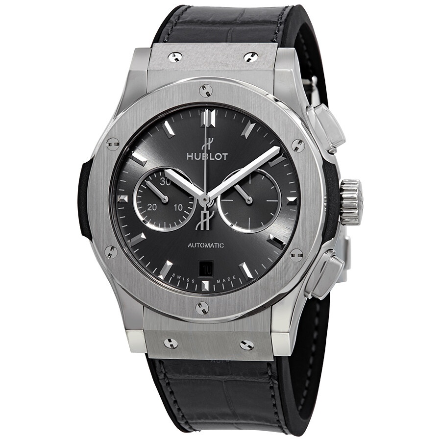 Titanium case with a grey (alligator) leather strap. Fixed titanium bezel. Grey dial with silver-tone hands and index hour markers. Minute markers around the outer rim. Dial Type: Analog. Date display at the 6 o'clock position. Chronograph - two sub-dials displaying: 60 second and 30 minute. Hublot calibre HUB1153 automatic movement with a 42-hour power reserve. Scratch resistant sapphire crystal. Transparent case back. Round case shape. Case size: 42 mm. Push button fold over clasp. Water resistant at 50 meters / 165 feet. Functions: chronograph, date, hour, minute, second. Luxury watch style. Watch label: Swiss Made. Hublot Classic Fusion Chronograph Automatic Men's Watch 541.NX.7070.LR. INFORMATION Brand: Hublot Series: Classic Fusion Collection Name: Classic Fusion Gender: Mens Model: 541.NX.7070.LR Watch Label: Swiss Made Movement: Automatic Engine: Hublot Calibre HUB1153 Power Reserve: 42 hours CASE Case Size: 42 mm Case Material: Titanium Case Shape: Round Case Back: Transparent BAND Band Material: Alligator Leather Band Type: Strap Band Color: Grey Clasp: Push Button Fold Over DIAL Dial Color: Grey Type: Analog Crystal: Scratch Resistant Sapphire Hands: Silver-tone Dial Markers: Index Second Markers: Minute Markers around the outer rim Sub Dials: Two - 60 Second and 30 Minute Bezel: Fixed Bezel Color: Grey Bezel Material: Titanium FEATURES Water Resistance: 50 meters / 165 feet Calendar: Date display at the 6 o'clock position Functions: Chronograph, Date, Hour, Minute, Second Watch Features: Chronograph, Titanium, Leather, Analog, Alligator Leather ADDITIONAL INFO Watch Style: Luxury Warranty: 2 Year Jomashop Warranty UPC Code: 842047140659 Jomashop Sku: HB541NX7070LR Department: Watches Category: Watches