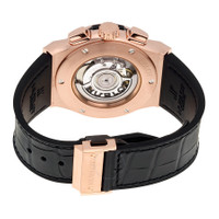18kt rose gold case with a black rubber strap with a stiched black (alligator) leather stiched top. Fixed 18kt rose gold bezel. Black composite resin bezel lug sandwiched between the bezel and case. Black skeleton dial with rose gold-tone hands and index hour markers. Minute markers around the outer rim. Dial Type: Analog. Date display at the 6 o'clock position. Chronograph - two sub-dials displaying: 60 second and 30 minute. Hublot calibre HUB1155 automatic movement, based upon ETA 2892, containing 60 Jewels, composed of 207 parts, bitting at 28800 vph, and has a power reserve of approximately 42 hours. Scratch resistant sapphire crystal. Screw down crown. Skeleton case back. Round case shape. Case size: 45 mm. Band width: 20 mm. Deployment with push button release clasp. Water resistant at 50 meters / 165 feet. Functions: chronograph, date, hour, minute, second. Classic Fusion Series. Luxury watch style. Watch label: Swiss Made. Item Variations: 525 OX 0180 LR, 525-OX-0180-LR, 525/OX/0180/LR, 525OX0180LR. Hublot Classic Fusion Chronograph Black Dial Men's Watch 525OX0180LR. GENERAL Box Type: Original Box Color: Black / Gold CASE Case Size: 45 Case Material: 18kt Rose Gold Case Shape: Round Case Back: Skeleton BAND Band Material: Rubber with a Black (Alligator) Leather Top Band Type: Strap Band Color: Black Band Width: 20 mm Clasp: Deployment with Push Button Release DIAL Dial Color: Black Skeleton Type: Analog Crystal: Scratch Resistant Sapphire Hands: Rose Gold-tone Dial Markers: Index Second Markers: Minute Markers around the outer rim Sub Dials: Two - 60 Second and 30 Minute Bezel: Fixed Bezel Material: 18kt Rose Gold Crown: Screw Down INFORMATION Brand: Hublot Series: Classic Fusion Collection Name: Classic Fusion Gender: Mens Model: 525.OX.0180.LR Watch Label: Swiss Made Movement: Automatic Engine: Hublot Calibre HUB1155 Power Reserve: 42 hours FEATURES Water Resistance: 50 meters / 165 feet Calendar: Date display at the 6 o'clock position Functions: Chronograph, Date, Hour, Minute, Second Watch Features: Alligator Leather, Analog, Gold, Leather, Rubber, Chronograph ADDITIONAL INFO Watch Style: Luxury Warranty: 2 Year Jomashop Warranty Jomashop Sku: HB525OX0180LR Item Variation: 525 OX 0180 LR, 525-OX-0180-LR, 525/OX/0180/LR, 525OX0180LR Department: Watches Category: Watches