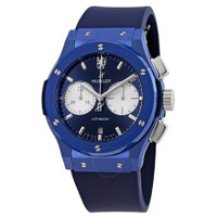 Blue ceramic case with a blue rubber strap. Fixed blue ceramic bezel. Blue dial with silver-tone hands and index hour markers. Minute markers around the outer rim. Dial Type: Analog. Chronograph - two silver sub-dials displaying: 60 second and 30 minute. Automatic movement. Scratch resistant sapphire crystal. Pull / push crown. Transparent case back. Round case shape. Case size: 45 mm. Case thickness: 13.05 mm. Deployment clasp with a push button release. Water resistant at 50 meters / 165 feet. Functions: chronograph, hour, minute, second. Classic Fusion Series. Dress watch style. Watch label: Swiss Made. Hublot Classic Fusion Chronograph Automatic Blue Dial Limited Edition Men's Watch 521.EX.7179.RX.CFC19. GENERAL Box Type: Original Box CASE Case Size: 45 Case Thickness: 13.05 mm Case Material: Ceramic Case Shape: Round Case Back: Transparent BAND Band Material: Rubber Band Type: Strap Band Color: Blue Clasp: Deployment With Push Button Release DIAL Dial Color: Blue Type: Analog Crystal: Scratch Resistant Sapphire Hands: Silver-tone Dial Markers: Index Second Markers: Minute Markers around the outer rim Sub Dials: Two - 60 Second and 30 Minute Bezel: Fixed Bezel Color: Blue Bezel Material: Ceramic Crown: Pull / Push INFORMATION Brand: Hublot Series: Classic Fusion Collection Name: Classic Fusion Gender: Mens Model: 521.EX.7179.RX.CFC19 Watch Label: Swiss Made Movement: Automatic FEATURES Water Resistance: 50 meters / 165 feet Functions: Chronograph, Hour, Minute, Second Watch Features: Analog, Ceramic, Rubber, Chronograph ADDITIONAL INFO Watch Style: Dress Warranty: 2 Year Jomashop Warranty Jomashop Sku: HB521EX7179RXCFC19 Department: Watches Category: Watches