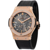 18 carat rose gold case with a alligator outer / rubber inner strap. Fixed bezel. Skeleton dial with rose gold-tone hands and index hour markers. Dial Type: Analog. One- 60 seconds. Hand Wind movement. Caliber hub1300.4 engine. Scratch resistant sapphire crystal. Pull / push crown. Skeleton transparent exhibition see through case back. Case diameter: 45 mm. Round case shape. Water resistant at 50 meters / 165 feet. Functions: hour, minute, second. Additional Info: bezel set with 126 diamonds (1.41 carats). Luxury watch style. Watch label: Swiss Made. Item Variations: 515 OX 0180 LR 1104, 515-OX-0180-LR-1104, 515/OX/0180/LR/1104, 515OX0180LR1104. Hublot Classic Fusion Classico Ultra Thin Skeleton Dial Hand Wind Men's Watch 515.OX.0180.LR.1104. GENERAL Box Type: Original Box CASE Case Diameter: 45 mm Case Material: 18kt Rose Gold Case Shape: Round Case Back: Skeleton Transparent Exhibition See Through BAND Band Material: Alligator Outer / Rubber Inner Band Type: Strap Band Color: Black DIAL Dial Color: Skeleton Type: Analog Crystal: Scratch Resistant Sapphire Hands: Rose Gold-tone Dial Markers: Index Sub Dials: One - Small Second Bezel: Fixed Bezel Color: 18kt Rose Gold Bezel Material: Diamond Set Crown: Pull / Push INFORMATION Brand: Hublot Series: Classic Fusion Collection Name: Classic Fusion Classico Ultra Thin Gender: Mens Model: 515.OX.0180.LR.1104 Watch Label: Swiss Made Movement: Hand Wind Engine: Hublot Calibre HUB1300.4 Power Reserve: 90 hours FEATURES Water Resistance: 50 meters / 165 feet Functions: Hour, Minute, Second Watch Features: Alligator Leather, Analog, Gold, Rubber, Diamond ADDITIONAL INFO Watch Style: Luxury Warranty: 2 Year Jomashop Warranty Additional Info: bezel set with 126 diamonds (1.41 carats) Jomashop Sku: HB515OX0180LR1104 Item Variation: 515 OX 0180 LR 1104, 515-OX-0180-LR-1104, 515/OX/0180/LR/1104, 515OX0180LR1104 Department: Watches Category: Watches