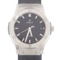 Grey titanium case with a black alligator outer / rubber inner strap. Fixed grey diamond set bezel. Mat black dial with rhodium- plated hands and index hour markers. Dial Type: Analog. Date display at the 3 o'clock position. Hublot Calibre HUB1112 Automatic movement, based upon Sellita SW300-1, containing 25 Jewels, composed of 63 parts, bitting at 28800 vph, and has a power reserve of approximately 42 hours. Scratch resistant sapphire crystal. Skeleton transparent exhibition see through case back. Round case shape, case size: 45 mm. Deployment with push button release clasp. Water resistant at 50 meters / 165 feet. Functions: date, hour, minute, second. Additional Info: bezel set with 126 diamonds, (1.41 carats). Classic Fusion Series. Luxury watch style. Watch label: Swiss Made. Hublot Classic Fusion Mat Black Dial Automatic Men's Diamonds Watch 511.NX.1171.LR.1104. GENERAL Box Type: Original Box CASE Case Size: 45 Case Material: Titanium Case Shape: Round Case Back: Skeleton Transparent Exhibition See Through BAND Band Material: Alligator Outer / Rubber Inner Band Type: Strap Band Color: Black Clasp: Deployment with Push Button Release DIAL Dial Color: Mat Black Type: Analog Crystal: Scratch Resistant Sapphire Hands: Rhodium- Plated Dial Markers: Index Bezel: Fixed Bezel Color: Grey Bezel Material: Diamond Set INFORMATION Brand: Hublot Series: Classic Fusion Collection Name: Classic Fusion Gender: Mens Model: 511.NX.1171.LR.1104 Watch Label: Swiss Made Movement: Automatic Engine: Hublot Calibre HUB1112 Power Reserve: 42 hours FEATURES Water Resistance: 50 meters / 165 feet Calendar: Date display at the 3 o'clock position Functions: Date, Hour, Minute, Second Watch Features: Alligator Leather, Analog, Rubber, Titanium, Diamond ADDITIONAL INFO Watch Style: Luxury Warranty: 2 Year Jomashop Warranty Additional Info: bezel set with 126 diamonds, (1.41 carats) Jomashop Sku: HB511NX1171LR1104 Department: Watches Category: Watches