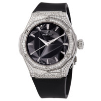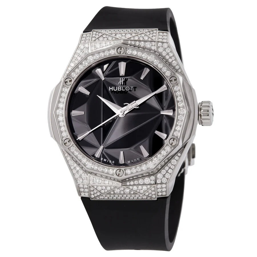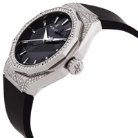 Polished titanium case with a black rubber strap. Fixed bezel. Black dial with silver-tone hands and index hour markers. Dial Type: Analog. Hublot Calibre HUB1110 Automatic movement, based upon Sellita SW300-1, containing 21 Jewels, composed of 63 parts, bitting at 28800 vph, and has a power reserve of approximately 42 hours. Scratch resistant sapphire crystal. Pull / push crown. Transparent see through case back. Dodecagon case shape, case size: 40 mm. Push button deployant buckle clasp. Water resistant at 50 meters / 150 feet. Functions: hour, minute, second. Additional Info: bezel set with 54 diamonds (0.6ct), case with 210 diamonds (~1.0ct). Classic Fusion Orlinski Series. Luxury watch style. Watch label: Swiss Made. Hublot Classic Fusion Orlinski Automatic Black Dial Men's Watch 550.NS.1800.RX.1604.ORL19. GENERAL Box Type: Original Box CASE Case Material: Polished Titanium Case Shape: Dodecagon Case Back: Transparent See Through BAND Band Material: Rubber Band Type: Strap Band Color: Black Clasp: Push Button Deployant Buckle DIAL Dial Color: Black Type: Analog Crystal: Scratch Resistant Sapphire Hands: Silver-tone Dial Markers: Index Bezel: Fixed Bezel Material: Diamond Set Crown: Pull / Push INFORMATION Brand: Hublot Series: Classic Fusion Orlinski Collection Name: Classic Fusion Orlinski Gender: Mens Model: 550.NS.1800.RX.1604.ORL19 Watch Label: Swiss Made Movement: Automatic Engine: Hublot Calibre HUB1110 Power Reserve: 42 hours FEATURES Water Resistance: 50 meters / 150 feet Functions: Hour, Minute, Second Watch Features: Analog, Rubber, Titanium, Diamond ADDITIONAL INFO Watch Style: Luxury Warranty: 2 Year Jomashop Warranty Additional Info: bezel set with 54 diamonds (0.6ct), case with 210 diamonds (~1.0ct) Jomashop Sku: HB550NS1800RX1604ORL Department: Watches Category: Watches