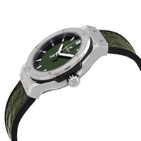 Grey titanium case with a black rubber strap with a (stiched) green (alligator) leather top. Fixed grey titanium bezel. Black composite resin bezel lug sandwiched between the bezel and case. Green sunray dial with silver-tone hands and index hour markers. Dial Type: Analog. Date display at the 3 o'clock position. Hublot calibre HUB2912 quartz movement. Scratch resistant sapphire crystal. Pull / push crown. Solid case back. Round case shape. Case size: 33 mm. Deployment clasp. Water resistant at 50 meters / 165 feet. Functions: date, hour, minute, second. Classic Fusion Series. Luxury watch style. Watch label: Swiss Made. Hublot Classic Fusion Quartz Green Dial Ladies Watch 581.NX.8970.LR. INFORMATION Brand: Hublot Series: Classic Fusion Collection Name: Classic Fusion Gender: Womens Model: 581.NX.8970.LR Watch Label: Swiss Made Movement: Quartz Engine: Hublot Calibre HUB2912 CASE Case Size: 33 mm Case Material: Titanium Case Shape: Round Case Back: Solid BAND Band Material: Rubber with a Green (Alligator) Leather Top Band Type: Strap Band Color: Green Clasp: Deployment DIAL Dial Color: Green Sunray Type: Analog Crystal: Scratch Resistant Sapphire Hands: Silver-tone Dial Markers: Index Bezel: Fixed Bezel Color: Grey Bezel Material: Titanium Crown: Pull / Push FEATURES Water Resistance: 50 meters / 165 feet Calendar: Date display at the 3 o'clock position Functions: Date, Hour, Minute, Second Watch Features: Titanium, Rubber, Leather, Analog, Alligator Leather ADDITIONAL INFO Watch Style: Luxury Warranty: 2 Year Jomashop Warranty UPC Code: 842047146156 Jomashop Sku: HB581NX8970LR Department: Watches Category: Watches
