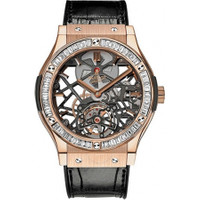18k king gold case with a black alligator leather strap. Fixed bezel set with baguette diamonds bezel. Skeleton dial with rose gold-tone hands and index hour markers. Dial Type: Analog. Hand wind movement. Mhub 610.h1.8 engine. Scratch resistant sapphire crystal. Case diameter: 45 mm. Round case shape. Water resistant at 50 meters / 165 feet. Functions: hour, minute. Luxury watch style. Watch label: Swiss Made. Item Variations: 505 OX 0180 LR 1904, 505-OX-0180-LR-1904, 505/OX/0180/LR/1904, 505OX0180LR1904. Hublot Classic Fusion Tourbillon 18K King Gold Baguette Diamond Men's Watch 505.OX.0180.LR.1904. GENERAL Box Type: Original Box CASE Case Size: 45 Case Material: 18kt King Gold Case Shape: Round BAND Band Material: Alligator Leather Band Type: Strap Band Color: Black DIAL Dial Color: Skeleton Type: Analog Crystal: Scratch Resistant Sapphire Hands: Rose Gold-Tone Dial Markers: Index Bezel: Fixed Set with Baguette Diamonds INFORMATION Brand: Hublot Series: Classic Fusion Collection Name: Classic Fusion Tourbillon Gender: Mens Model: 505.OX.0180.LR.1904 Watch Label: Swiss Made Movement: Hand Wind Engine: Hublot Calibre MHUB610.H1.8 Power Reserve: 120 hours FEATURES Water Resistance: 50 meters / 165 feet Functions: Tourbillon, Hour, Minute Watch Features: Alligator Leather, Analog, Gold, Leather, Diamond, Tourbillon ADDITIONAL INFO Watch Style: Luxury Warranty: 2 Year Jomashop Warranty Jomashop Sku: HB505OX0180LR1904 Item Variation: 505 OX 0180 LR 1904, 505-OX-0180-LR-1904, 505/OX/0180/LR/1904, 505OX0180LR1904 Department: Watches Category: Watches