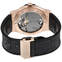 18kt rose gold case with a black leather strap. Fixed 18kt rose gold bezel. Black dial with gold-tone hands and index hour markers. Gold. Dial Type: Analog. Luminescent hands and markers. One subdial displaying: tourbillon. Hublot Calibre HUB6010 Hand Wind movement, containing 19 Jewels, composed of 155 parts, bitting at 21600 vph, and has a power reserve of approximately 115 hours. Scratch resistant sapphire crystal. Pull / push crown. Transparent case back. Round case shape, case size: 45 mm. Fold over with safety release clasp. Water resistant at 30 meters / 100 feet. Functions: tourbillon, hour, minute. Classic Fusion Tourbillon Series. Luxury watch style. Watch label: Swiss Made. Item Variations: 505 OX 1180 LR, 505-OX-1180-LR, 505/OX/1180/LR, 505OX1180LR. Hublot Classic Fusion Tourbillon 45mm Dial Black Men's Luxury Watch 505.OX.1180.LR. GENERAL Box Type: Original Box CASE Case Size: 45 Case Material: 18kt Rose Gold Case Shape: Round Case Back: Transparent BAND Band Material: Leather Band Type: Strap Band Color: Black Clasp: Fold Over with Safety Release DIAL Dial Color: Black Type: Analog Crystal: Scratch Resistant Sapphire Hands: Gold-tone Dial Markers: Index Second Markers: Gold Sub Dials: One - Tourbillon Luminiscence: Hands and Markers Bezel: Fixed Bezel Material: 18kt Rose Gold Crown: Pull / Push INFORMATION Brand: Hublot Series: Classic Fusion Collection Name: Classic Fusion Tourbillon Gender: Mens Model: 505.OX.1180.LR Watch Label: Swiss Made Movement: Hand Wind Engine: Hublot Calibre HUB6010 Power Reserve: 120 hours FEATURES Water Resistance: 30 meters / 100 feet Functions: Tourbillon, Hour, Minute Watch Features: Analog, Gold, Leather, Tourbillon ADDITIONAL INFO Watch Style: Luxury Warranty: 2 Year Jomashop Warranty Jomashop Sku: HB505OX1180LR Item Variation: 505 OX 1180 LR, 505-OX-1180-LR, 505/OX/1180/LR, 505OX1180LR Department: Watches Category: Watches