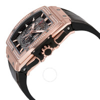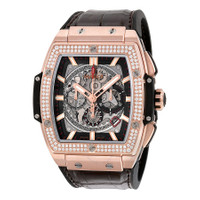 Satin-finished 18kt king gold case with a brown leather strap. Fixed 18kt king gold bezel set with diamonds. Black (skeleton center) dial with luminous king gold hands and index hour markers. Minute markers around the outer rim. Dial Type: Analog. Luminescent hands and markers. Date display between the 4 and 5 o'clock positions. Hublot calibre HUB4700 automatic movement, containing 31 Jewels, composed of 278 parts, bitting at 36000 vph, and has a power reserve of approximately 50 hours. Scratch resistant sapphire crystal. Pull / push crown. Transparent case back. Tonneau case shape. Case dimensions: 51 mm x 45 mm. Deployment clasp. Water resistant at 100 meters / 330 feet. Functions: chronograph, date, hour, minute, second. Spirit Of Big Bang Series. Luxury watch style. Watch label: Swiss Made. Item Variations: 601 OX 0183 LR 1104, 601-OX-0183-LR-1104, 601/OX/0183/LR/1104, 601OX0183LR1104. Hublot Spirit of Big Bang 18kt King Gold Diamond Men's Watch 601.OX.0183.LR.1104. GENERAL Box Type: Original Box CASE Case Size: 45 Case Material: Satin-Finished 18kt King Gold Case Shape: Tonneau Case Back: Transparent BAND Band Material: Leather Band Type: Strap Band Color: Brown Clasp: Deployment DIAL Dial Color: Black (Skeleton Center) Type: Analog Crystal: Scratch Resistant Sapphire Hands: Luminous King Gold Dial Markers: Index Second Markers: Minute Markers around the outer rim Luminiscence: Hands and Markers Bezel: Fixed Bezel Material: 18kt King Gold set with Diamonds Crown: Pull / Push INFORMATION Brand: Hublot Series: Spirit Of Big Bang Collection Name: Spirit of Big Bang Gender: Mens Model: 601.OX.0183.LR.1104 Watch Label: Swiss Made Movement: Automatic Engine: Hublot Calibre HUB4700 Power Reserve: 50 hours FEATURES Water Resistance: 100 meters / 330 feet Calendar: Date display between the 4 and 5 o'clock positions Functions: Chronograph, Date, Hour, Minute, Second Watch Features: Analog, Gold, Leather, Chronograph, Diamond ADDITIONAL INFO Watch Style: Luxury Warranty: 2 Year Jomashop Warranty UPC Code: 845960069687 Jomashop Sku: HB601OX0183LR1104 Item Variation: 601 OX 0183 LR 1104, 601-OX-0183-LR-1104, 601/OX/0183/LR/1104, 601OX0183LR1104 Department: Watches Category: Watches
