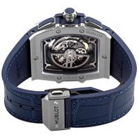 Grey titanium case with a blue rubber strap with a blue (alligator) leather top. Fixed grey titanium bezel. Lateral case center bezel lugs of blue composite resin. Skeleton dial with luminous silver-tone hands and index hour markers. Minute markers around the outer rim. Dial Type: Analog. Luminescent hands and markers. Date display between 4 and 5 o'clock position. Chronograph - three sub-dials displaying: 60 second, 30 minute and 12 hour. Hublot calibre HUB4700 automatic movement, containing 31 Jewels, composed of 278 parts, bitting at 36000 vph, and has a power reserve of approximately 50 hours. Scratch resistant sapphire crystal. Pull / push crown. Transparent case back. Tonneau case shape. Case dimensions: 51 mm x 45 mm. Deployment clasp with a push button release. Water resistant at 100 meters / 330 feet. Functions: chronograph, date, hour, minute, second. Spirit Of Big Bang Series. Luxury watch style. Watch label: Swiss Made. Hublot Spirit Of Big Bang Chronograph Automatic Men's Watch 601.NX.7170.LR. GENERAL Box Type: Original Box CASE Case Size: 45 Case Material: Titanium Case Shape: Tonneau Case Back: Transparent BAND Band Material: Rubber with Blue (Alligator) Leather Top Band Type: Strap Band Color: Blue Clasp: Deployment with Push Button Release DIAL Dial Color: Skeleton Type: Analog Crystal: Scratch Resistant Sapphire Hands: Luminous Silver-tone Dial Markers: Index Second Markers: Minute Markers around the outer rim Sub Dials: Three - 60 Second, 30 Minute and 12 Hour Luminiscence: Hands and Markers Bezel: Fixed Bezel Color: Grey Bezel Material: Titanium Crown: Pull / Push INFORMATION Brand: Hublot Series: Spirit Of Big Bang Collection Name: Spirit Of Big Bang Gender: Mens Model: 601.NX.7170.LR Watch Label: Swiss Made Movement: Automatic Engine: Hublot Calibre HUB4700 Power Reserve: 50 FEATURES Water Resistance: 100 meters / 330 feet Calendar: Date display between 4 and 5 o'clock position Functions: Chronograph, Date, Hour, Minute, Second Watch Features: Alligator Leather, Analog, Leather, Rubber, Titanium, Chronograph ADDITIONAL INFO Watch Style: Luxury Warranty: 2 Year Jomashop Warranty Jomashop Sku: HB601NX7170LR Department: Watches Category: Watches