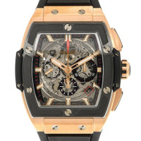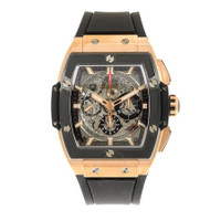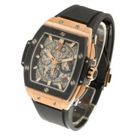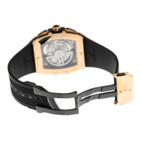 Rose gold-tone 18kt rose gold case with a black rubber strap. Fixed black ceramic bezel. Transparent dial with rose gold-tone hands and index hour markers. Minute markers around the outer rim. Dial Type: Analog. Luminescent hands and markers. Date display between 4 and 5 o'clock position. Chronograph - three sub-dials displaying: 60 second, 30 minute and 12 hour. Hublot Calibre HUB4700 Automatic movement, containing 31 Jewels, composed of 278 parts, bitting at 36000 vph, and has a power reserve of approximately 50 hours. Scratch resistant sapphire crystal. Transparent see through case back. Tonneau case shape, case size: 42 mm. Deployment with push button release clasp. Water resistant at 100 meters / 330 feet. Functions: chronograph, date, hour, minute, second. Additional Info: original box, international warranty card, manual (complete accessories). Spirit Of Big Bang Series. Luxury watch style. Watch label: Swiss Made. Hublot Spirit Of Big Bang Chronograph Automatic Men's Watch 641. GENERAL Box Type: Original Box CASE Case Size: 42 Case Material: 18kt Rose Gold Case Shape: Tonneau Case Back: Transparent See Through BAND Band Material: Rubber Band Type: Strap Band Color: Black Clasp: Deployment with Push Button Release DIAL Dial Color: Transparent Type: Analog Crystal: Scratch Resistant Sapphire Hands: Rose Gold-tone Dial Markers: Index Second Markers: Minute Markers around the outer rim Sub Dials: Three - 60 Second, 30 Minute and 12 Hour Luminiscence: Hands and Markers Bezel: Fixed Bezel Color: Black Bezel Material: Ceramic INFORMATION Brand: Hublot Series: Spirit Of Big Bang Collection Name: Spirit Of Big Bang Gender: Mens Model: 641.OM.0183.RX Watch Label: Swiss Made Movement: Automatic Engine: Hublot Calibre HUB4700 Power Reserve: 50 hours FEATURES Water Resistance: 100 meters / 330 feet Calendar: Date display between 4 and 5 o'clock position Functions: Chronograph, Date, Hour, Minute, Second Watch Features: Analog, Ceramic, Gold, Rubber, Chronograph ADDITIONAL INFO Watch Style: Luxury Warranty: 2 Year Jomashop Warranty Additional Info: Original Box, Manual (Complete Accessories) Jomashop Sku: HB641OM0183RX Department: Watches Category: Watches