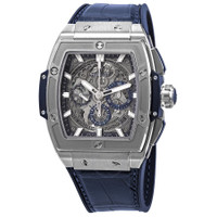 Grey titanium case with a blue rubber/(alligator) leather strap. Fixed grey titanium bezel. Silver-tone dial with silver-tone hands and index hour markers. Minute markers around the outer rim. Dial Type: Analog. Luminescent hands and markers. Date display between 4 and 5 o'clock position. Chronograph - three sub-dials displaying: 60 second, 30 minute and 12 hour. Hublot Calibre HUB4700 Automatic movement, containing 31 Jewels, composed of 278 parts, bitting at 36000 vph, and has a power reserve of approximately 50 hours. Scratch resistant sapphire crystal. Transparent case back. Tonneau case shape, case size: 42 mm. Titanium and black-plated titanium deployant clasp. Water resistant at 100 meters / 330 feet. Functions: chronograph, date, hour, minute, second. Spirit Of Big Bang Series. Luxury watch style. Watch label: Swiss Made. Hublot Spirit of Big Bang Chronograph Automatic Silver Dial Men's Watch 641.NX.7170.LR. GENERAL Box Type: Original Box CASE Case Size: 42 Case Material: Titanium Case Shape: Tonneau Case Back: Transparent BAND Band Material: Rubber/(Alligator) Leather Band Type: Strap Band Color: Blue Clasp: Titanium and Black-plated Titanium Deployant DIAL Dial Color: Silver-tone Type: Analog Crystal: Scratch Resistant Sapphire Hands: Silver-tone Dial Markers: Index Second Markers: Minute Markers around the outer rim Sub Dials: Three - 60 Second, 30 Minute and 12 Hour Luminiscence: Hands and Markers Bezel: Fixed Bezel Color: Grey Bezel Material: Titanium INFORMATION Brand: Hublot Series: Spirit Of Big Bang Collection Name: Spirit of Big Bang Gender: Mens Model: 641.NX.7170.LR Watch Label: Swiss Made Movement: Automatic Engine: Hublot Calibre HUB4700 Power Reserve: 50 hours FEATURES Water Resistance: 100 meters / 330 feet Calendar: Date display between 4 and 5 o'clock position Functions: Chronograph, Date, Hour, Minute, Second Watch Features: Alligator Leather, Analog, Leather, Rubber, Titanium, Chronograph ADDITIONAL INFO Watch Style: Luxury Warranty: 2 Year Jomashop Warranty Jomashop Sku: HB641NX7170LR Department: Watches Category: Watches