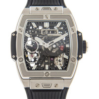 Grey titanium case with a black rubber strap. Fixed grey titanium bezel with a black bezel base. Transparent dial with luminous silver-tone hands and index hour markers. Minute markers around the outer rim. Dial Type: Analog. Luminescent hands and markers. Small seconds sub-dial. Power reserve indicator. Hublot calibre HUB1233 hand wind movement with a 240-hour power reserve. Scratch resistant sapphire crystal. Screw down crown. Transparent case back. Tonneau case shape. Case size: 45 mm. Case thickness: 14.45 mm. Fold over clasp. Water resistant at 50 meters / 165 feet. Functions: hour, minute, small second, power reserve indicator. Sspirit Of Big Bang Series. Luxury watch style. Watch label: Swiss Made. Hublot Sspirit of Big Bang Meca 10 Titanium Hand Wind Men's Watch 614.NX.1170.RX. GENERAL Box Type: Original Box CASE Case Size: 45 Case Thickness: 14.45 mm Case Material: Titanium Case Shape: Tonneau Case Back: Transparent BAND Band Material: Rubber Band Type: Strap Band Color: Black Clasp: Fold Over DIAL Dial Color: Transparent Type: Analog Crystal: Scratch Resistant Sapphire Hands: Luminous Silver-tone Dial Markers: Index Second Markers: Minute Markers around the outer rim Sub Dials: Small Seconds. Power Reserve Indicator Luminiscence: Hands and Markers Bezel: Fixed Bezel Color: Grey Bezel Material: Titanium with Black Bezel Base Crown: Screw Down INFORMATION Brand: Hublot Series: Spirit Of Big Bang Collection Name: Sspirit of Big Bang Gender: Mens Model: 614.NX.1170.RX Watch Label: Swiss Made Movement: Hand Wind Engine: Hublot Calibre HUB1233 Power Reserve: 240 hours FEATURES Water Resistance: 50 meters / 165 feet Functions: Hour, Minute, Small Second, Power Reserve Indicator Watch Features: Analog, Power Reserve Indicator, Rubber, Titanium ADDITIONAL INFO Watch Style: Luxury Warranty: 2 Year Jomashop Warranty Jomashop Sku: HB614NX1170RX Department: Watches Category: Watches