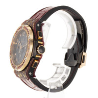 Rose gold-tone 18kt rose gold case with a red leather strap. Fixed rose gold-tone bezel with diamond set 18kt rose gold. Black dial with rose gold-tone hands and index hour markers. Minute markers around the outer rim. Dial Type: Analog. Date display between 4 and 5 o'clock position. Automatic movement. Transparent see through case back. Round case shape, case size: 41 mm. Deployment with push button release clasp. Functions: chronograph, date, hour, minute, second. Big Bang Series. Luxury watch style. Watch label: Swiss Made. Pre-owned Hublot Big Bang Chronograph Automatic Diamond Black Dial Ladies Watch 341.XG.1280.LR.1213. GENERAL Year: Circa 2015 Comments: This Hublot Big Bang 41mm, reference number 341.XG.1280.LR.1213 , has a manufacturer year of Circa 2015. Box not included, Papers not included . This watch has a 41mm Rose Gold Case with Rose gold bezel, Black Index numerals dial and Leather bracelet with Fold clasp. The Automatic movement has Chronograph function. The wrist measures 6.5 inches or 16.51 centimeters. The condition is Very Good The watch listed is in stock and the pictures shown are of the actual watch for sale. All of our watche Preowned Item Condition: Very Good CASE Case Material: 18kt Rose Gold Case Shape: Round Case Back: Transparent See Through BAND Band Material: Leather Band Type: Strap Band Color: Red Clasp: Deployment with Push Button Release DIAL Dial Color: Black Type: Analog Hands: Rose Gold-tone Dial Markers: Index Second Markers: Minute Markers around the outer rim Bezel: Fixed Bezel Color: Rose Gold-tone Bezel Material: Diamond Set 18kt Rose Gold INFORMATION Brand: Hublot Series: Big Bang Collection Name: Big Bang Gender: Womens Model: 341.XG.1280.LR.1213 Watch Label: Swiss Made Movement: Automatic FEATURES Calendar: Date display between 4 and 5 o'clock position Functions: Chronograph, Date, Hour, Minute, Second Watch Features: Analog, Gold, Leather, Chronograph, Diamond ADDITIONAL INFO Watch Style: Luxury Warranty: 1 Year Jomashop Warranty Jomashop Sku: PRE-P-HB104700 Department: Watches Category: Watches