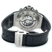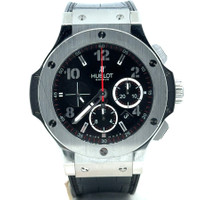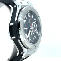 Pre-owned Stainless steel case with lateral black Kevlar inserts and a black rubber strap. Fixed stainless steel bezel. Black dial with lumious silver-tone skeleton hands and alternating Arabic numeral and index hour markers. Minute markers around outter rim. Dial Type: Analog. Luminescent hands and markers. Date display between the 4 and 5 o'clock positions. Chronograph - three sub-dials displaying: 12 hours, 30 minutes, small seconds. Hublot calibre HUB4100 automatic movement, based upon ETA 2894-2, containing 27 Jewels, composed of 252 parts, bitting at 28800 vph, and has a power reserve of approximately 42 hours. Scratch resistant sapphire crystal. Pull / push crown. Transparent case back. Round case shape. Case size: 44 mm. Case thickness: 14.5 mm. Band width: 25 mm. Band length: 8.5 inches. Deployment clasp. Water resistant at 100 meters / 330 feet. Functions: chronograph, date, hour, minute, second. Dress watch style. Watch label: Swiss Made. Item Variations: 301.SX.130.RX, 301-SX-130-RX, 301/SX/130/RX, 301SX130RX. Hublot Big Bang Automatic 44mm Men's Watch 301.SX.130.RX. GENERAL Collection Name: Big Bang INFORMATION Brand: Hublot Series: Big Bang Model: 301.SX.130.RX Gender: Mens Watch Label: Swiss Made Movement: Automatic Engine: Hublot Calibre HUB4100 Power Reserve: 42 hours CONDITION INFORMATION Box: No Preowned Item Condition: Excellent Papers: Yes CASE Case Size: 44 Case Thickness: 14.5 mm Case Material: Stainless Steel Case Shape: Round Case Back: Transparent DIAL Type: Analog Dial Color: Black Crystal: Scratch Resistant Sapphire Hands: Lumious Silver-tone Skeleton Second Markers: Minute markers around outter rim Dial Markers: Arabic Numeral and Index Sub Dials: Three - 12 Hour, 30 Minute and Small Second Luminiscence: Hands and Markers Bezel: Fixed Bezel Color: Silver-tone Bezel Material: Stainless Steel Crown: Pull / Push BAND Band Type: Strap Band Material: Rubber Band Color: Black Band Width: 25 mm Clasp: Deployment with Push Button Release FEATURES Water Resistance: 100 meters / 330 feet Calendar: Date display between 4 and 5 o'clock position Functions: Chronograph, Date, Hour, Minute, Second Watch Features: Analog, Rubber, Stainless Steel, Chronograph ADDITIONAL INFO Watch Style: Dress Warranty: 1 Year Jomashop Warranty UPC Code: 0845858078432 Jomashop Sku: PRE-P-HB76665 Department: Watches Category: Watches