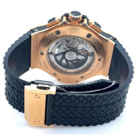Rose gold-tone 18kt rose gold case with a black rubber strap. Fixed rose gold-tone bezel with diamond set 18kt rose gold. Black dial with rose gold-tone skeleton hands and gold tone Arabic and stick hour markers. Minute markers around the outer rim. Dial Type: Analog. Luminescent hands. Date display between 4 and 5 o'clock position. Chronograph - three sub-dials displaying: 60 second, 30 minute and 12 hour. Hublot Calibre HUB2894 Automatic movement, containing 37 Jewels, bitting at 28800 vph, and has a power reserve of approximately 42 hours. Scratch resistant sapphire crystal. Transparent see through case back. Round case shape, case size: 41 mm. Band width: 24 mm. Deployment clasp. Water resistant at 100 meters / 330 feet. Functions: chronograph, date, hour, minute, second. Big Bang Series. Luxury watch style. Watch label: Swiss Made. Item Variations: 341 PX 130 RX 114, 341-PX-130-RX-114, 341/PX/130/RX/114, 341PX130RX114. Pre-owned Hublot Big Bang Chronograph Diamond Black Dial Men's Watch 341.PX.130.RX.114. GENERAL Preowned Item Condition: Excellent CASE Case Material: 18kt Rose Gold Case Shape: Round Case Back: Transparent See Through BAND Band Material: Rubber Band Type: Strap Band Color: Black Band Width: 24 mm Clasp: Deployment DIAL Dial Color: Black Type: Analog Crystal: Scratch Resistant Sapphire Hands: Rose Gold-tone Skeleton Dial Markers: Gold Tone Arabic and Stick Second Markers: Minute Markers Around The Outer Rim Sub Dials: Three - 60 Second, 30 Minute and 12 Hour Luminiscence: Hands Bezel: Fixed Bezel Color: Rose Gold-tone Bezel Material: Diamond Set 18kt Rose Gold INFORMATION Brand: Hublot Series: Big Bang Collection Name: Big Bang Gender: Mens Model: 341.PX.130.RX.114 Watch Label: Swiss Made Movement: Automatic Engine: Hublot Calibre HUB2894 Power Reserve: 42 hours FEATURES Water Resistance: 100 meters / 330 feet Calendar: Date display between 4 and 5 o'clock position Functions: Chronograph, Date, Hour, Minute, Second Watch Features: Analog, Gold, Rubber, Chronograph, Diamond ADDITIONAL INFO Watch Style: Luxury Warranty: 1 Year Jomashop Warranty Jomashop Sku: PRE-P-HB104076 Item Variation: 341 PX 130 RX 114, 341-PX-130-RX-114, 341/PX/130/RX/114, 341PX130RX114 Department: Watches Category: Watches