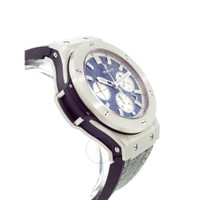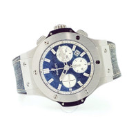Pre-owned Satin-finished stainless steel case with a blue denim strap. Fixed silver-tone stainless steel bezel. Blue jean dial with luminous silver-tone skeleton hands and index hour markers. Minute markers around the outer rim. Dial Type: Analog. Date display between 4 and 5 o'clock position. Chronograph - three sub-dials displaying: 60 second, 30 minute and 12 hour. Hublot Calibre HUB4100 Automatic movement, based upon ETA 2894-2, containing 27 Jewels, composed of 252 parts, bitting at 28800 vph, and has a power reserve of approximately 42 hours. Scratch resistant sapphire crystal. Screw down crown. Round case shape. Case size: 44 mm. Deployment clasp. Water resistant at 100 meters / 330 feet. Functions: chronograph, date, hour, minute, second. Luxury watch style. Watch label: Swiss Made. Item Variations: 301 SX 2710 NR JEANS, 301-SX-2710-NR-JEANS, 301SX2710NRJEANS. Hublot Big Bang Evolution Blue Jeans Chronograph Automatic Men's Watch 301.SX.2710.NR.JEANS. Box: No ,Paper: No GENERAL Collection Name: Big Bang Evoultion Jeans INFORMATION Brand: Hublot Series: Big Bang Evoultion Jeans Model: 301.SX.2710.NR.JEANS Gender: Mens Watch Label: Swiss Made Movement: Automatic Engine: Hublot Calibre HUB4100 Power Reserve: 42 hours CONDITION INFORMATION Box: No Preowned Item Condition: Excellent Papers: No Year: 2015 CASE Case Size: 44 mm Case Material: Satin-Finished Stainless Steel Case Shape: Round DIAL Type: Analog Dial Color: Blue Jean Crystal: Scratch Resistant Sapphire Hands: Luminous Silver-tone Skeleton Second Markers: Minute Markers around the outer rim Dial Markers: Index Sub Dials: Three - 60 Second, 30 Minute and 12 Hour Luminiscence: Hands and Markers Bezel: Fixed Bezel Color: Silver-tone Bezel Material: Stainless Steel Crown: Screw Down BAND Band Type: Strap Band Material: Denim Band Color: Blue Clasp: Deployment FEATURES Water Resistance: 100 meters / 330 feet Calendar: Date display between 4 and 5 o'clock position Functions: Chronograph, Date, Hour, Minute, Second Watch Features: Chronograph, Stainless Steel, Analog ADDITIONAL INFO Watch Style: Luxury Warranty: 1 Year Jomashop Warranty Jomashop Sku: PRE-P-HB35151 Department: Watches Category: Watches