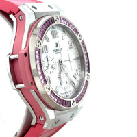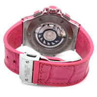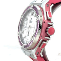 Pre-owned Stainless steel and kevlar case with a pink rubber alligator bracelet. Stainless steel set with 48 pink spinelle baguette bezel. Mother of pearl dial with silver-tone hands and index and Arabic hour markers. Minute markers on outer rim. Luminescent hands and markers. Date display between the 4 and 5 o'clock position. 12 hours, 30 minutes and 1/4th of a second. Automatic movement. Scratch resistant sapphire crystal. Stainless steel and kevlar crown. Case diameter: 41 mm. Deployment clasp. Water resistant at 100 meters / 330 feet. Luxury watch style. Hublot Tutti Frutti Mother of Pearl Dial Automatic Pink Rubber Alligator Ladies Watch 341.SP.6010.LR.1933. GENERAL Collection Name: Big Bang Tutti Frutti INFORMATION Brand: Hublot Series: Big Bang Tutti Frutti Model: 341.SP.6010.LR.1933 Gender: Womens Watch Label: Swiss Made Movement: Automatic CONDITION INFORMATION Box: No Preowned Item Condition: Excellent Papers: No CASE Case Size: 41 mm Case Material: Stainless steel and Kevlar Case Shape: Round DIAL Type: Analog Dial Color: Mother of Pearl Crystal: Scratch Resistant Sapphire Hands: Silver-Tone Second Markers: Minute Markers on outer rim Dial Markers: Index and Arabic Sub Dials: Three - 12 Hour, 30 Minute and 1/4th of a second Luminiscence: Hands and Markers Bezel: Stainless steel set with 48 Pink Spinelle Baguette Crown: Stainless steel and Kevlar BAND Band Type: Strap Band Material: Pink Rubber Alligator Clasp: Deployment FEATURES Water Resistance: 100 Meters / 330 Feet Calendar: Date display between 4 and 5 o'clock position Functions: Chronograph, Date, Hour, Minute, Second Watch Features: Alligator Leather, Analog, Rubber, Stainless Steel, Chronograph ADDITIONAL INFO Watch Style: Luxury Warranty: 1 Year Jomashop Warranty Jomashop Sku: PRE-P-HB77706 Department: Watches Category: Watches