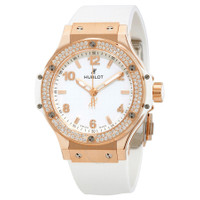 Pre-owned 18 kt rose gold case with a white silicone bracelet. Fixed 18 kt rose gold bezel set with 126 diamonds. White dial with gold-tone hands and index and Arabic hour markers. Minute markers around outer rim. Dial Type: analog. Swiss quartz movement. Scratch resistant sapphire crystal. Gold and kevlar crown. Case diameter: 38 mm. Case thickness: 12 mm. Deployment clasp. Water resistant at 100 meters / 330 feet. Functions: hour, minute, second. Luxury watch style. Hublot Big Bang Diamond Ladies Watch 361PE2010LR1104. GENERAL Collection Name: Big Bang INFORMATION Brand: Hublot Series: Big Bang Model: 361.PE.2010.RW.1104 Gender: Womens Watch Label: Swiss Made Movement: Quartz CONDITION INFORMATION Box: No Preowned Item Condition: Very Good Papers: No CASE Case Size: 38 Case Thickness: 12 mm Case Material: 18kt Rose Gold Case Shape: Round Case Back: Solid DIAL Type: Analog Dial Color: White Crystal: Scratch Resistant Sapphire Hands: Gold-tone Second Markers: Minute Markers around outer rim Dial Markers: Index and Arabic Bezel: Fixed 18kt Rose Gold set with 126 Diamonds Crown: Gold and Kevlar BAND Band Type: Strap Band Material: Silicone Band Color: White Clasp: Deployment FEATURES Water Resistance: 100 meters / 330 feet Functions: Hour, Minute, Second Watch Features: Analog, Gold, Diamond ADDITIONAL INFO Watch Style: Luxury Warranty: 1 Year Jomashop Warranty UPC Code: 845960027304 Jomashop Sku: PRE-P-HB88185 Department: Watches