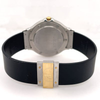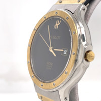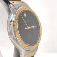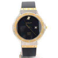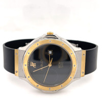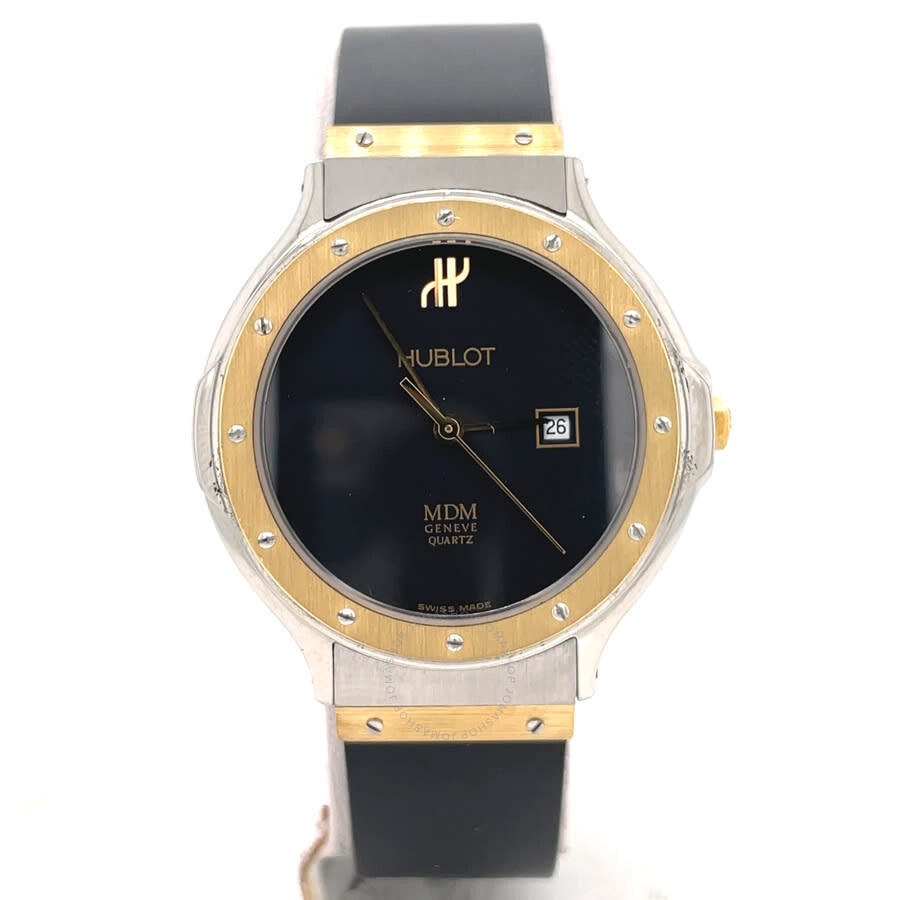 Silver-tone stainless steel case with a black rubber strap. Fixed yellow gold-tone 18kt yellow gold bezel. Black dial with yellow gold-tone hands. Dial Type: Analog. Date display at the 3 o'clock position. Quartz movement. Scratch resistant sapphire crystal. Pull / push crown. Solid case back. Round case shape, case size: 32 mm, case thickness: 6.6 mm. Band width: 14 mm. Hidden clasp. Water resistant at 30 meters / 100 feet. Functions: date, hour, minute, second. Classic Mdm Series. Luxury watch style. Watch label: Swiss Made. Pre-owned Hublot Classic MDM Black Dial Ladies Watch 1401.2. GENERAL Collection Name: Classic MDM INFORMATION Brand: Hublot Series: Classic Mdm Model: 1401.2 Gender: Womens Watch Label: Swiss Made Movement: Quartz CONDITION INFORMATION Box: No Preowned Item Condition: Excellent Papers: No CASE Case Size: 32 mm Case Thickness: 6.6 mm Case Material: Stainless Steel Case Shape: Round Case Back: Solid DIAL Type: Analog Dial Color: Black Crystal: Scratch Resistant Sapphire Hands: Yellow Gold-tone Bezel: Fixed Bezel Color: Yellow Gold-tone Bezel Material: 18kt Yellow Gold Crown: Pull / Push BAND Band Type: Strap Band Material: Rubber Band Color: Black Band Width: 14 mm Clasp: Hidden FEATURES Water Resistance: 30 meters / 100 feet Calendar: Date display at the 3 o'clock position Functions: Date, Hour, Minute, Second Watch Features: Stainless Steel, Rubber, Gold, Analog ADDITIONAL INFO Watch Style: Luxury Warranty: 1 Year Jomashop Warranty Jomashop Sku: PRE-P-HB61608 Department: Watches Category: Watches