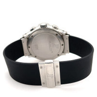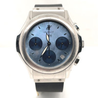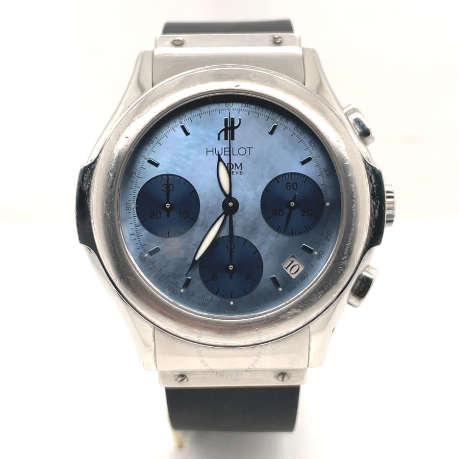 Silver-tone stainless steel case with a black rubber strap. Fixed silver-tone stainless steel bezel. Blue dial with blue hands and index hour markers. Minute markers around the outer rim. Dial Type: Analog. Luminescent hands. Date display between 4 and 5 o'clock position. Chronograph - three sub-dials displaying: 60 second, 30 minute and 12 hour. Automatic movement. Scratch resistant sapphire crystal. Screw down crown. Solid case back. Round case shape, case size: 40 mm, case thickness: 12 mm. Band width: 20 mm. Hidden clasp. Water resistant at 100 meters / 330 feet. Functions: chronograph, date, hour, minute, second. Hublot Mdm Series. Luxury watch style. Watch label: Swiss Made. Pre-owned Hublot Hublot MDM Chronograph Automatic Blue Dial Men's Watch 1810.1. GENERAL Collection Name: Hublot MDM INFORMATION Brand: Hublot Series: Hublot Mdm Model: 1810.1 Gender: Mens Watch Label: Swiss Made Movement: Automatic CONDITION INFORMATION Box: No Preowned Item Condition: Excellent Papers: No CASE Case Size: 40 mm Case Thickness: 12 mm Case Material: Stainless Steel Case Shape: Round Case Back: Solid DIAL Type: Analog Dial Color: Blue Crystal: Scratch Resistant Sapphire Hands: Blue Second Markers: Minute Markers around the outer rim Dial Markers: Index Sub Dials: Three - 60 Second, 30 Minute and 12 Hour Luminiscence: Hands Bezel: Fixed Bezel Color: Silver-tone Bezel Material: Stainless Steel Crown: Screw Down BAND Band Type: Strap Band Material: Rubber Band Color: Black Band Width: 20 mm Clasp: Hidden FEATURES Water Resistance: 100 meters / 330 feet Calendar: Date display between 4 and 5 o'clock position Functions: Chronograph, Date, Hour, Minute, Second Watch Features: Chronograph, Stainless Steel, Rubber, Analog ADDITIONAL INFO Watch Style: Luxury Warranty: 1 Year Jomashop Warranty Jomashop Sku: PRE-P-HB49458 Department: Watches Category: Watches