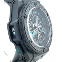 Pre-owned Black carbon fiber case with a black rubber with blue stitching strap. Fixed bezel. Black dial with blue-toned hands and index hour markers. Minute markers around the outer rim. Dial Type: Analog. Chronograph - three sub-dials displaying: 60 second, 60 minute and 30 minute. Automatic movement. Scratch resistant sapphire crystal. Case diameter: 48 mm. Round case shape. Deployment with push button clasp. Functions: hour, minute, second, date. Luxury watch style. Hublot King Power F1 Black Dial Carbon Fiber Rubber Men's Watch 719.QM.1729.NR.FAD11. GENERAL Preowned Item Condition: Excellent CASE Case Material: Carbon Fiber Case Shape: Round BAND Band Material: Rubber with Blue Stitching Band Type: Strap Band Color: Black Clasp: Deployment with Push Button Release DIAL Dial Color: Black Type: Analog Crystal: Scratch Resistant Sapphire Hands: Blue-toned Dial Markers: Index Second Markers: Minute Markers around the outer rim Sub Dials: Three - 60 Second, 60 Minute and 30 Minute Luminiscence: Hands and Markers Bezel: Fixed INFORMATION Brand: Hublot Series: King Power Collection Name: King Power F1 Abu Dhabi Gender: Mens Model: 719.QM.1729.NR.FAD11 Watch Label: Swiss Made Movement: Automatic Engine: Hublot Calibre HUB4247 Power Reserve: 42 hours FEATURES Water Resistance: 100 meters / 330 feet Functions: Hour, Minute, Second, Date Watch Features: Analog, Rubber, Chronograph ADDITIONAL INFO Watch Style: Luxury Warranty: 1 Year Jomashop Warranty Jomashop Sku: PRE-P-HB76470 Department: Watches Category: Watches