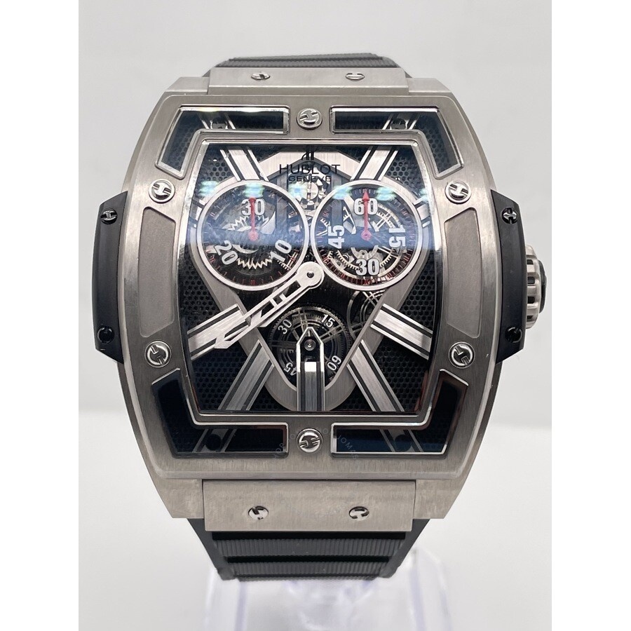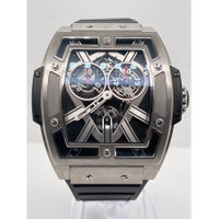 Grey titanium case with a black rubber strap. Fixed grey titanium bezel. Black dial with silver-tone hands and index hour markers. Dial Type: Analog. Luminescent hands and markers. Hublot Calibre HUB5100 automatic movement with a 240-hour power reserve. Scratch resistant sapphire crystal. Transparent see through case back. Tonneau case shape, case size: 48 mm. Deployment with push button release clasp. Water resistant at 100 meters / 330 feet. Functions: chronograph, hour, minute, second. Additional Info: limited to only 10pcs. Masterpiece Mp 01 Series. Luxury watch style. Watch label: Swiss Made. Pre-owned Hublot Masterpiece MP 01 Chronograph Automatic Black Dial Men's Watch 901.NX.0129.RX. GENERAL Collection Name: Masterpiece MP 01 INFORMATION Brand: Hublot Series: Masterpiece Mp 01 Model: 901.NX.0129.RX Gender: Mens Watch Label: Swiss Made Movement: Automatic Engine: Hublot Calibre HUB5100 Power Reserve: 240 hours CONDITION INFORMATION Box: Yes Preowned Item Condition: Excellent Papers: Yes CASE Case Size: 48 mm Case Material: Titanium Case Shape: Tonneau Case Back: Transparent See Through DIAL Type: Analog Dial Color: Black Crystal: Scratch Resistant Sapphire Hands: Silver-tone Dial Markers: Index Luminiscence: Hands and Markers Bezel: Fixed Bezel Color: Grey Bezel Material: Titanium BAND Band Type: Strap Band Material: Rubber Band Color: Black Clasp: Deployment with Push Button Release FEATURES Water Resistance: 100 meters / 330 feet Functions: Chronograph, Hour, Minute, Second Watch Features: Chronograph, Titanium, Rubber, Analog ADDITIONAL INFO Watch Style: Luxury Warranty: 1 Year Jomashop Warranty Additional Info: Limited to only 10pcs Jomashop Sku: PRE-P-HB42363 Department: Watches Category: Watches