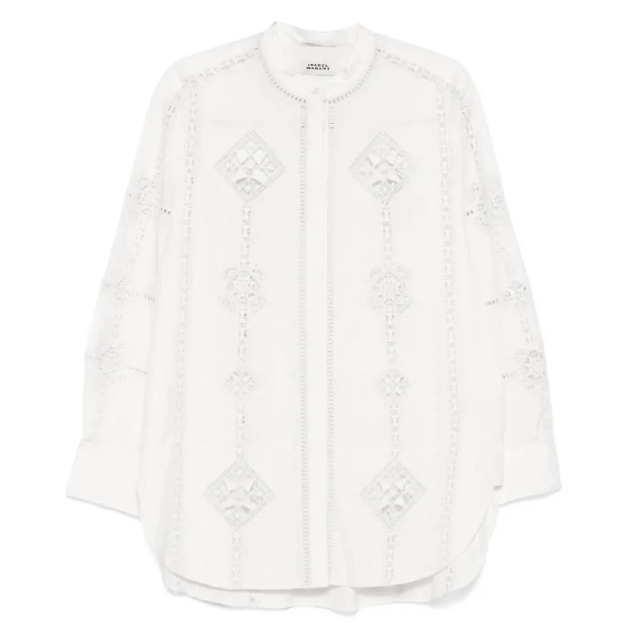 Isabel Marant Ladies Outerwear. Fashion category: Shirts & Blouses. SKU: PCH0203FAC1J11I-WHITE.Color: White. Isabel Marant Soeline Openwork Cotton Shirt. This shirt is crafted from openwork cotton poplin and features an officer collar with a concealed button placket for a clean, refined look. Designed with long sleeves, straight buttoned cuffs, and delicate English embroidery details, it offers a straight, effortless silhouette that blends elegance with understated charm. 100% Cotton. GENERAL Color: White INFORMATION Brand: Isabel Marant Gender: Womens Model: PCH0203FAC1J11I-WHITE DETAILS Category: Outerwear Apparel Type: Shirts & Blouses Material: Cotton ADDITIONAL INFO Jomashop Sku: -CH0203FAC1J11IWHITE Department: Clothing