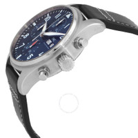 Silver-tone stainless steel case with a black leather strap. Fixed silver-tone stainless steel bezel. Blue dial with silver-tone hands and Arabic numeral hour markers. Minute markers around the outer rim. Luminescent hands and markers. Day of the week and date display at the 3 o'clock position. Chronograph - three sub-dials displaying: 60 second, 30 minute and 1/10th of a second. IWC Calibre 69385 Automatic movement, containing 33 Jewels, composed of 231 parts, bitting at 28800 vph, and has a power reserve of approximately 46 hours. Scratch resistant sapphire crystal. Screw down crown. Transparent case back. Round case shape, case size: 41 mm, case thickness: 14.5 mm. Tang clasp. Water resistant at 100 meters / 330 feet. Functions: chronograph, date, day, hour, minute, second. Pilot Series. Sport watch style. Watch label: Swiss Made. IWC Pilot Chronograph Automatic Blue Dial Men's Watch IW388101BK. INFORMATION Brand: IWC Series: Pilot Collection Name: Pilot Gender: Mens Model: IW388101BK Watch Label: Swiss Made Movement: Automatic Engine: IWC Calibre 69385 Power Reserve: 46 hours CASE Case Size: 41 mm Case Thickness: 14.5 mm Case Material: Stainless Steel Case Shape: Round Case Back: Transparent BAND Band Material: Leather Band Type: Strap Band Color: Black Clasp: Tang DIAL Dial Color: Blue Crystal: Scratch Resistant Sapphire Hands: Silver-tone Dial Markers: Arabic Numeral Second Markers: Minute Markers around the outer rim Sub Dials: Three - 60 Second, 30 Minute and 1/10th of a Second Luminiscence: Hands and Markers Bezel: Fixed Bezel Color: Silver-tone Bezel Material: Stainless Steel Crown: Screw Down FEATURES Water Resistance: 100 meters / 330 feet Calendar: Day of the Week and Date display at the 3 o'clock position Functions: Chronograph, Date, Day, Hour, Minute, Second Watch Features: Chronograph, Stainless Steel, Leather ADDITIONAL INFO Watch Style: Sport Warranty: 2 Year Jomashop Warranty Jomashop Sku: IWC3881-01BK Department: Watches Category: Watches