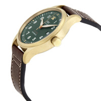 Bronze case with a brown (calfskin) leather strap. Fixed bronze bezel. Green dial with luminous bronze-tone hands and Arabic numeral hour markers. Minute markers around the outer rim. Dial Type: Analog. Luminescent hands and markers. Date display at the 3 o'clock position. IWC calibre 32110 automatic movement, based upon ETA 2892-A2, containing 21 Jewels, bitting at 28800 vph, and has a power reserve of approximately 72 hours. Scratch resistant sapphire crystal. Screw down crown. Solid case back. Round case shape. Case size: 39 mm. Case thickness: 10.6 mm. Band width: 20 mm. Tang clasp. Water resistant at 60 meters / 200 feet. Functions: date, hour, minute, second. Additional Info: frequency 28800.0 vph (4.0 hz). 21 jewels. Pilot Spitfire Series. Pilot watch style. Watch label: Swiss Made. IWC Pilot Spitfire Automatic Green Dial Men's Watch IW326802. CASE Case Size: 39 Case Thickness: 10.6 mm Case Material: Bronze Case Shape: Round Case Back: Solid BAND Band Material: (Calfskin) Leather Band Type: Strap Band Color: Brown Band Width: 20 mm Clasp: Tang DIAL Dial Color: Green Type: Analog Crystal: Scratch Resistant Sapphire Hands: Luminous Bronze-tone Dial Markers: Arabic Numeral Second Markers: Minute Markers around the outer rim Luminiscence: Hands and Markers Bezel: Fixed Bezel Material: Bronze Crown: Screw Down INFORMATION Brand: IWC Series: Pilot Spitfire Collection Name: Pilot Spitfire Gender: Mens Model: IW326802 Watch Label: Swiss Made Movement: Automatic Engine: IWC Calibre 32110 Power Reserve: 72 hours FEATURES Water Resistance: 60 meters / 200 feet Calendar: Date display at the 3 o'clock position Functions: Date, Hour, Minute, Second Watch Features: Leather, Analog ADDITIONAL INFO Watch Style: Pilot Warranty: 2 Year Jomashop Warranty UPC Code: 7613375191230 Additional Info: Frequency 28800.0 vph (4.0 hz). 21 Jewels Jomashop Sku: IWC3268-02 Department: Watches Category: Watches