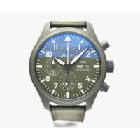 Green ceramic case with a green canvas strap. Fixed green ceramic bezel. Green dial with green hands and Arabic numeral hour markers. Minute markers around the outer rim. Dial Type: Analog. Luminescent hands and markers. Day of the week and date display at the 3 o'clock position. Chronograph - three sub-dials displaying: 60 second, 30 minute and 12 hour. IWC Calibre 69380 Automatic movement, based upon WC 69370, containing 33 Jewels, bitting at 28800 vph, and has a power reserve of approximately 48 hours. Scratch resistant sapphire crystal. Screw down crown. Solid case back. Round case shape, case size: 44.5 mm. Band width: 20 mm. Buckle clasp. Water resistant at scratch resistant sapphire. Functions: chronograph, column wheel, date, day, hour, minute, small second. Pilot Top Gun Woodland Series. Luxury watch style. Watch label: Swiss Made. IWC Pilot Top Gun Woodland Chronograph Automatic Green Dial Men's Watch IW389106. CASE Case Size: 44 Case Material: Ceramic Case Shape: Round Case Back: Solid BAND Band Material: Canvas Band Type: Strap Band Color: Green Band Width: 20 mm Clasp: Buckle DIAL Dial Color: Green Type: Analog Crystal: Scratch Resistant Sapphire Hands: Green Dial Markers: Arabic Numeral Second Markers: Minute Markers around the outer rim Sub Dials: Three - 60 Second, 30 Minute and 12 Hour Luminiscence: Hands and Markers Bezel: Fixed Bezel Color: Green Bezel Material: Ceramic Crown: Screw Down INFORMATION Brand: IWC Series: Pilot Top Gun Woodland Collection Name: Pilot Top Gun Woodland Gender: Mens Model: IW389106 Watch Label: Swiss Made Movement: Automatic Engine: IWC Calibre 69380 Power Reserve: 48 hours FEATURES Water Resistance: Scratch Resistant Sapphire Calendar: Day of the Week and Date display at the 3 o'clock position Functions: Chronograph, Column Wheel, Date, Day, Hour, Minute, Small Second Watch Features: Chronograph, Ceramic, Analog ADDITIONAL INFO Watch Style: Luxury Warranty: 2 Year Jomashop Warranty Jomashop Sku: IWC3891-06 Department: Watches Category: Watches
