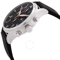 Silver-tone stainless steel case with a black rubber strap. Fixed silver-tone stainless steel bezel. Black dial with rose gold-tone hands and Arabic numeral hour markers. Minute markers around the outer rim. Dial Type: Analog. Luminescent hands and markers. Day of the week and date display at the 3 o'clock position. Chronograph - three sub-dials displaying: 60 second, 30 minute and 12 hour. IWC Calibre 69385 Automatic movement, containing 33 Jewels, composed of 231 parts, bitting at 28800 vph, and has a power reserve of approximately 46 hours. Scratch resistant sapphire crystal. Screw down crown. Transparent see through case back. Round case shape, case size: 43 mm, case thickness: 14.8 mm. Band width: 21 mm. Water resistant at 100 meters / 330 feet. Functions: chronograph, column wheel, date, day, hour, minute, small second. Pilots Series. Luxury watch style. Watch label: Swiss Made. IWC Pilots Chronograph Automatic Black Dial Men's Watch IW378009. GENERAL Box Type: Original Box CASE Case Thickness: 14.8 mm Case Material: Stainless Steel Case Shape: Round Case Back: Transparent See Through BAND Band Material: Rubber Band Type: Strap Band Color: Black Band Width: 21 mm Clasp: Buckle DIAL Dial Color: Black Type: Analog Crystal: Scratch Resistant Sapphire Hands: Rose Gold-tone Dial Markers: Arabic Numeral Second Markers: Minute Markers around the outer rim Sub Dials: Three - 60 Second, 30 Minute and 12 Hour Luminiscence: Hands and Markers Bezel: Fixed Bezel Color: Silver-tone Bezel Material: Stainless Steel Crown: Screw Down INFORMATION Brand: IWC Series: Pilot Collection Name: Pilots Gender: Mens Model: IW378009 Watch Label: Swiss Made Movement: Automatic Engine: IWC Calibre 69385 Power Reserve: 46 hours FEATURES Water Resistance: 100 meters / 330 feet Calendar: Day of the Week and Date display at the 3 o'clock position Functions: Chronograph, Column Wheel, Date, Day, Hour, Minute, Small Second Watch Features: Analog, Gold, Rubber, Stainless Steel, Chronograph ADDITIONAL INFO Watch Style: Luxury Warranty: 2 Year Jomashop Warranty Jomashop Sku: IWC378009 Department: Watches