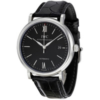 Stainless steel case with a black (alligator) leather strap. Fixed stainless steel bezel. Black dial with silver-tone leaf-style hands and index hour markers. Roman numerals mark the 6 and 12 o'clock positions. Arabic numeral minute markers (at 5 minute intervals). Minute markers around the outer rim. Dial Type: Analog. Date display at the 3 o'clock position. IWC calibre 35110 automatic movement, based upon Sellita SW300, containing 25 Jewels, bitting at 28800 vph, and has a power reserve of approximately 42 hours. Scratch resistant sapphire crystal. Pull / push crown. Solid case back. Round case shape. Case size: 40 mm, case thickness: 9.5 mm. Band width: 20 mm. Band length: 8 inches. Tang clasp. Water resistant at 30 meters / 100 feet. Functions: date, hour, minute, second. Portofino Series. Dress watch style. Watch label: Swiss Made. IWC Portofino Automatic Black Dial Black Leather Men's Watch 3565-02. GENERAL Color: Black INFORMATION Brand: IWC Series: Portofino Collection Name: Portofino Gender: Mens Model: IW356502 Watch Label: Swiss Made Movement: Automatic Engine: IWC Calibre 35110 Power Reserve: 42 hours CASE Case Size: 40 mm Case Thickness: 9.5 mm Case Material: Stainless Steel Case Shape: Round Case Back: Solid BAND Band Material: (Alligator) Leather Band Type: Strap Band Color: Black Band Length: 8 inches Band Width: 20 mm Clasp: Tang DIAL Dial Color: Black Type: Analog Crystal: Scratch Resistant Sapphire Hands: Silver-tone Leaf-style Dial Markers: Index Second Markers: Roman Numerals mark the 6 and 12 o'clock positions. Arabic Numeral Minute Markers (at 5 minute intervals). Minute Markers around the outer rim Bezel: Fixed Bezel Color: Silver-tone Bezel Material: Stainless Steel Crown: Pull / Push FEATURES Water Resistance: 30 meters / 100 feet Calendar: Date display at the 3 o'clock position Functions: Date, Hour, Minute, Second Watch Features: Stainless Steel, Leather, Analog, Alligator Leather ADDITIONAL INFO Watch Style: Dress Warranty: 2 Year Jomashop Warranty UPC Code: 7640127775431 Jomashop Sku: IWC3565-02 Department: Watches Category: Watches