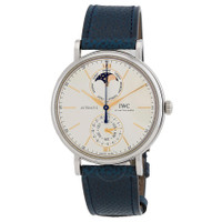 Silver-tone stainless steel case with a blue calfskin strap band. Uni-directional rotating silver-tone stainless steel bezel. Silver dial with rose gold-tone hands and index hour markers. Minute markers around the outer rim. Dial Type: Analog. Two sub-dials displaying: moonphase and date,day and month. IWC Calibre 32150 automatic movement with a 72-hour power reserve. Scratch resistant sapphire crystal. Transparent see through case back. Round case shape, case size: 41 mm. Band width: 20 mm. Buckle clasp. Water resistant at 50 meters / 165 feet. Functions: hours, minutes, central hacking seconds, date, day, month, and moon phase. Dress watch style. Watch label: Swiss Made. IWC Automatic Silver Dial Watch IW359001. CASE Case Size: 41 Case Material: Stainless Steel Case Shape: Round Case Back: Transparent See Through BAND Band Material: Calfskin Strap Band Type: Strap Band Color: Blue Band Width: 20 mm Clasp: Buckle DIAL Dial Color: Silver Type: Analog Crystal: Scratch Resistant Sapphire Hands: Rose Gold-tone Dial Markers: Index Second Markers: Minute Markers around the outer rim Sub Dials: Two - Moonphase and Date,Day and Month Bezel: Uni-directional Rotating Bezel Color: Silver-tone Bezel Material: Stainless Steel INFORMATION Brand: IWC Series: Portofino Collection Name: Portofino Gender: Mens Model: IW359001 Watch Label: Swiss Made Movement: Automatic Engine: IWC Calibre 32150 Power Reserve: 72 hours FEATURES Water Resistance: 50 meters / 165 feet Functions: Hours, minutes, central hacking seconds, date, day, month, and moon phase Watch Features: Moon Phase, Stainless Steel, Gold, Month, Analog ADDITIONAL INFO Watch Style: Dress Warranty: 2 Year Jomashop Warranty Jomashop Sku: IWC359001 Department: Watches Category: Watches