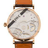 18kt rose gold case with a dark brown alligator leather strap. Fixed 18kt rose gold bezel. Silver-plated dial with rose gold-tone leaf-style shape hands and index and Roman numeral hour markers. Minute markers around the outer rim. Dial Type: Analog. One subdial displaying: power reserve indicator on caseback. IWC Calibre 59060 Hand Wind movement, based upon IWC 59210, containing 30 Jewels, bitting at 28800 vph, and has a power reserve of approximately 192 hours. Scratch resistant sapphire crystal. Transparent see through case back. Round case shape, case size: 43.5 mm, case thickness: 12 mm. Band width: 22 mm. Pin buckle clasp. Water resistant at 30 meters / 100 feet. Functions: hour, minute, power reserve indicator. Portofino Series. Luxury watch style. Watch label: Swiss Made. IWC Portofino Silver-Plated Dial 18K Rose Gold Men's Watch IW511101. CASE Case Size: 43 Case Thickness: 12 mm Case Material: 18kt Rose Gold Case Shape: Round Case Back: Transparent See Through BAND Band Material: Alligator Leather Band Type: Strap Band Color: Dark Brown Band Width: 22 mm Clasp: Pin Buckle DIAL Dial Color: Silver-Plated Type: Analog Crystal: Scratch Resistant Sapphire Hands: Rose Gold-Tone Leaf-style shape Dial Markers: Index and Roman Numeral Second Markers: Minute Markers around the outer rim Sub Dials: One - Power Reserve Indicator on Caseback Bezel: Fixed Bezel Material: 18kt Rose Gold INFORMATION Brand: IWC Series: Portofino Collection Name: Portofino Gender: Mens Model: IW511101 Watch Label: Swiss Made Movement: Hand Wind Engine: IWC Calibre 59060 Power Reserve: 192 hours FEATURES Water Resistance: 30 meters / 100 feet Functions: Hour, Minute, Power Reserve Indicator Watch Features: Leather, Gold, Power Reserve Indicator, Analog, Alligator Leather ADDITIONAL INFO Watch Style: Luxury Warranty: 2 Year Jomashop Warranty UPC Code: 611393854646 Jomashop Sku: IWC5111-01 Department: Watches Category: Watches