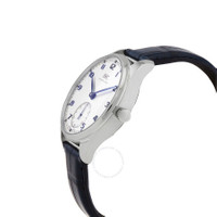Stainless steel case with a blue (alligator) laether band. Fixed stainless steel bezel. Silver dial with blue hands and Arabic numeral hour markers. Minute markers around the outer rim. Dial Type: Analog. One subdial displaying: small seconds. IWC calibre 82200 automatic movement, containing 33 Jewels, bitting at 28800 vph, and has a power reserve of approximately 60 hours. Scratch resistant sapphire crystal. Screw down crown. Transparent case back. Round case shape. Case size: 40.4 mm. Case thickness: 12.3 mm. Band width: 20 mm. Deployment clasp. Water resistant at 30 meters / 100 feet. Functions: hour, minute, small second. Portugieser Series. Luxury watch style. Watch label: Swiss Made. IWC Portugieser Automatic Silver Dial Men's Watch IW358304. INFORMATION Brand: IWC Series: Portugieser Collection Name: Portugieser Gender: Mens Model: IW358304 Watch Label: Swiss Made Movement: Automatic Engine: IWC Calibre 82200 Power Reserve: 60 hours CASE Case Size: 40.4 mm Case Thickness: 12.3 mm Case Material: Stainless Steel Case Shape: Round Case Back: Transparent BAND Band Material: (Alligator) Laether Band Type: Strap Band Color: Blue Band Width: 20 mm Clasp: Deployment DIAL Dial Color: Silver Type: Analog Crystal: Scratch Resistant Sapphire Hands: Blue Dial Markers: Arabic Numeral Second Markers: Minute Markers around the outer rim Sub Dials: Small Seconds Bezel: Fixed Bezel Color: Silver-tone Bezel Material: Stainless Steel Crown: Screw Down FEATURES Water Resistance: 30 meters / 100 feet Functions: Hour, Minute, Small Second Watch Features: Stainless Steel, Analog, Alligator Leather ADDITIONAL INFO Watch Style: Luxury Warranty: 2 Year Jomashop Warranty Jomashop Sku: IWC3583-04 Department: Watches Category: Watches