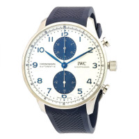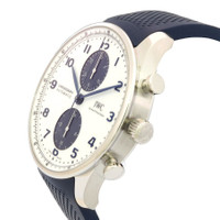 Stainless steel case with a blue rubber strap. Fixed bezel. White dial with Arabic numeral hour markers. Dial Type: Analog. Chronograph - two sub-dials displaying: 60 second and 30 minute. IWC Calibre 69355 Automatic movement, based upon IWC 69370, containing 27 Jewels, composed of 194 parts, bitting at 28800 vph, and has a power reserve of approximately 46 hours. Scratch resistant sapphire crystal. Transparent see through case back. Round case shape, case size: 41 mm, case thickness: 13 mm. Deployment clasp. Water resistant at 30 meters / 100 feet. Functions: chronograph, column wheel, hour, minute, small second. Portugieser Series. Luxury watch style. Watch label: Swiss Made. IWC Portugieser Chronograph Automatic White Dial Men's Watch IW371620. INFORMATION Brand: IWC Series: Portugieser Collection Name: Portugieser Gender: Mens Model: IW371620 Watch Label: Swiss Made Movement: Automatic Engine: IWC Calibre 69355 Power Reserve: 46 hours CASE Case Size: 41 mm Case Thickness: 13 mm Case Material: Stainless Steel Case Shape: Round Case Back: Transparent See Through BAND Band Material: Rubber Band Type: Strap Band Color: Blue Clasp: Deployment DIAL Dial Color: White Type: Analog Crystal: Scratch Resistant Sapphire Dial Markers: Arabic Numeral Sub Dials: Two - 60 Second and 30 Minute Bezel: Fixed FEATURES Water Resistance: 30 meters / 100 feet Functions: Chronograph, Column Wheel, Hour, Minute, Small Second Watch Features: Chronograph, Stainless Steel, Rubber, Analog ADDITIONAL INFO Watch Style: Luxury Warranty: 2 Year Jomashop Warranty Jomashop Sku: IW3716-20 Department: Watches Category: Watches