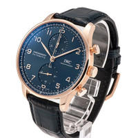 18kt rose gold case with a blue alligator leather strap. Fixed 18kt rose gold bezel. Blue dial with rose gold-tone hands and Arabic numeral hour markers. Dial Type: Analog. Chronograph - two sub-dials displaying: 60 second and 30 minute. IWC Calibre 69355 Automatic movement, based upon IWC 69370, containing 27 Jewels, composed of 194 parts, bitting at 28800 vph, and has a power reserve of approximately 46 hours. Scratch resistant sapphire crystal. Pull / push crown. Transparent case back. Round case shape, case size: 41 mm, case thickness: 13 mm. Band width: 20 mm. Water resistant at 30 meters / 100 feet. Functions: chronograph, column wheel, hour, minute, small second. Portugieser Chronograph Boutique Series. Luxury watch style. Watch label: Swiss Made. IWC Portugieser Chronograph Boutique Automatic Blue Dial Men's Watch IW371614. INFORMATION Brand: IWC Series: Portugieser Chronograph Boutique Collection Name: Portugieser Chronograph Boutique Gender: Mens Model: IW371614 Watch Label: Swiss Made Movement: Automatic Engine: IWC Calibre 69355 Power Reserve: 46 hours CASE Case Size: 41 mm Case Thickness: 13 mm Case Material: 18kt Rose Gold Case Shape: Round Case Back: Transparent BAND Band Material: Alligator Leather Band Type: Strap Band Color: Blue Band Width: 20 mm DIAL Dial Color: Blue Type: Analog Crystal: Scratch Resistant Sapphire Hands: Rose Gold-tone Dial Markers: Arabic Numeral Sub Dials: Two - 60 Second and 30 Minute Bezel: Fixed Bezel Material: 18kt Rose Gold Crown: Pull / Push FEATURES Water Resistance: 30 meters / 100 feet Functions: Chronograph, Column Wheel, Hour, Minute, Small Second Watch Features: Chronograph, Leather, Gold, Analog, Alligator Leather ADDITIONAL INFO Watch Style: Luxury Warranty: 2 Year Jomashop Warranty Jomashop Sku: IWC3716-14 Department: Watches Category: Watches