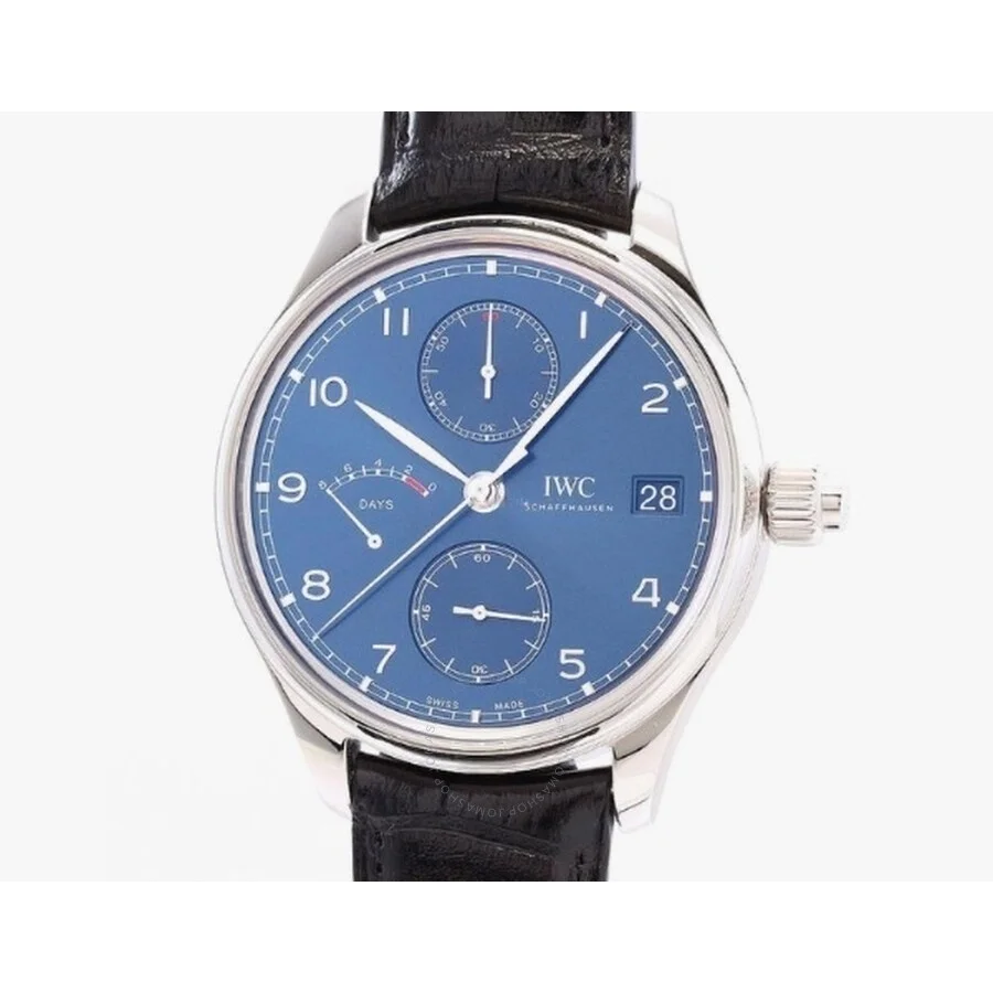 Silver-tone stainless steel case with a black alligator leather strap. Fixed silver-tone stainless steel bezel. Blue dial with silver-tone hands and Arabic numeral hour markers. Minute markers around the outer rim. Dial Type: Analog. Date display at the 3 o'clock position. Three sub-dials displaying: 60 second, 60 minute and power reserve. IWC Calibre 59360 Hand Wind movement, containing 36 Jewels, bitting at 28800 vph, and has a power reserve of approximately 192 hours. Scratch resistant sapphire crystal. Pull / push crown. Solid case back. Round case shape, case size: 46 mm, case thickness: 13.9 mm. Water resistant at 30 meters / 100 feet. Functions: chronograph, column wheel, monopoussoir, hour, minute, small second, power reserve indicator. Portugieser Monopusher "laureus Sport For Good" Series. Luxury watch style. Watch label: Swiss Made. IWC Portugieser Monopusher "Laureus Sport For Good" Chronograph Hand Wind Blue Dial Men's Watch IW515301. CASE Case Size: 46 Case Thickness: 13.9 mm Case Material: Stainless Steel Case Shape: Round Case Back: Solid BAND Band Material: Alligator Leather Band Type: Strap Band Color: Black DIAL Dial Color: Blue Type: Analog Crystal: Scratch Resistant Sapphire Hands: Silver-tone Dial Markers: Arabic Numeral Second Markers: Minute Markers around the outer rim Sub Dials: Three - 60 Second, 60 Minute and Power Reserve Bezel: Fixed Bezel Color: Silver-tone Bezel Material: Stainless Steel Crown: Pull / Push INFORMATION Brand: IWC Series: Portugieser Monopusher ALaureus Sport For Gooda Collection Name: Portugieser Monopusher aLaureus Sport For Gooda Gender: Mens Model: IW515301 Watch Label: Swiss Made Movement: Hand Wind Engine: IWC Calibre 59360 Power Reserve: 192 hours FEATURES Water Resistance: 30 meters / 100 feet Calendar: Date display at the 3 o'clock position Functions: Chronograph, Column Wheel, Monopoussoir, Hour, Minute, Small Second, Power Reserve Indicator Watch Features: Alligator Leather, Analog, Power Reserve Indicator, Leather, Stainless Steel, Chronograph ADDITIONAL INFO Watch Style: Luxury Warranty: 2 Year Jomashop Warranty Jomashop Sku: IWC5153-01 Department: Watches Category: Watches