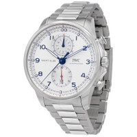 Stainless steel case with stainless steel bracelet. Fixed stainless steel bezel. Silver dial with luminous blue hands and Arabic numeral hour markers. Arabic numeral minute markers (at 5 minute intervals). Minute markers around the outer rim. Dial Type: Analog. Luminescent hands and markers. Date display at the 6 o'clock position. Chronograph - two sub-dials displaying: 60 second and 60 minute. IWC calibre 89361 automatic movement, based upon IWC 89360, containing 38 Jewels, and has a power reserve of approximately 68 hours. Scratch resistant sapphire crystal. Screw down crown. Transparent case back. Round case shape. Case size: 44.6 mm. Case thickness: 14.3 mm. Band width: 22 mm. Deployment clasp. Water resistant at 60 meters / 200 feet. Functions: chronograph, flyback, date, hour, minute, small second. Portugieser Yacht Club Series. Luxury watch style. Watch label: Swiss Made. IWC Portugieser Yacht Club Chronograph Automatic Silver Dial Men's Watch IW390702. CASE Case Size: 44.6 mm Case Thickness: 14.3 mm Case Material: Stainless Steel Case Shape: Round Case Back: Transparent BAND Band Material: Stainless Steel Band Type: Bracelet Band Color: Silver-tone Band Width: 22 mm Clasp: Deployment DIAL Dial Color: Silver Type: Analog Crystal: Scratch Resistant Sapphire Hands: LUminous Blue Dial Markers: Arabic Numeral Second Markers: Arabic Numeral Minute Markers (at 5 minute intervals). Minute Markers around the outer rim Sub Dials: Two - 60 Second and 60 Minute Luminiscence: Hands and Markers Bezel: Fixed Bezel Color: Silver-tone Bezel Material: Stainless Steel Crown: Screw Down INFORMATION Brand: IWC Series: Portugieser Yacht Club Collection Name: Portugieser Yacht Club Gender: Mens Model: IW390702 Watch Label: Swiss Made Movement: Automatic Engine: IWC Calibre 89361 Power Reserve: 68 hours FEATURES Water Resistance: 60 meters / 200 feet Calendar: Date display at the 6 o'clock position Functions: Chronograph, FlyBack, Date, Hour, Minute, Small Second Watch Features: Chronograph, Stainless Steel, Flyback, Analog ADDITIONAL INFO Watch Style: Luxury Warranty: 2 Year Jomashop Warranty Jomashop Sku: IWC3907-02 Department: Watches Category: Watches