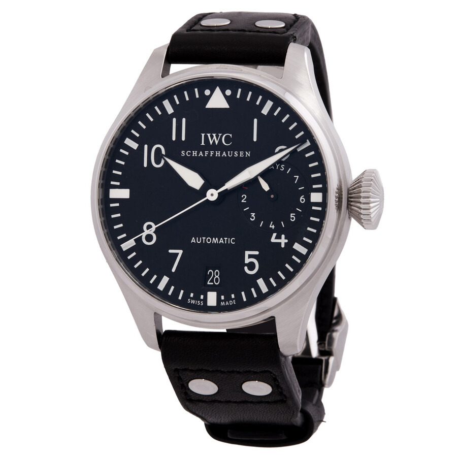 Silver-tone stainless steel case with a black leather strap. Fixed silver-tone stainless steel bezel. Black dial with luminous blue hands and Arabic numeral hour markers, minute markers on the outer rim hour markers. Minute markers around the outer rim. Dial Type: Analog. Luminescent hands and dial markers. Date display at the 6 o'clock position. Sub-dial displaying 7 day power reserve indicator subdials. IWC Calibre 51110 Automatic movement, based upon IWC 5011, containing 44 Jewels, bitting at 21600 vph, and has a power reserve of approximately 168 hours. Scratch resistant sapphire crystal. Onion-shaped fluted stainless steel big crown crown. Solid case back. Round case shape, case size: 46.2 mm, case thickness: 15.8 mm. Fold over clasp. Water resistant at 60 meters / 200 feet. Functions: hours, minutes, central seconds, power reserve, date. Additional Info: date displays at 6 o'clock position; 7-day power reserve displayed on small subidal. Big Pilots Watch Series. Pilot watch style. Watch label: Swiss Made. Pre-owned IWC Big Pilots Watch Automatic Black Dial Men's Watch IW500401. GENERAL Preowned Item Condition: Very Good CASE Case Thickness: 15.8 mm Case Material: Stainless Steel Case Shape: Round Case Back: Solid BAND Band Material: Leather Band Type: Strap Band Color: Black Clasp: Fold Over DIAL Dial Color: Black Type: Analog Crystal: Scratch Resistant Sapphire Hands: Luminous Blue Dial Markers: Arabic Numeral Hour Markers, Minute Markers on the outer rim Second Markers: Minute Markers around the outer rim Sub Dials: Sub-dial displaying 7 Day Power Reserve Indicator Luminiscence: Hands and Dial Markers Bezel: Fixed Bezel Color: Silver-tone Bezel Material: Stainless Steel Crown: Onion-shaped fluted stainless steel big crown INFORMATION Brand: IWC Series: Pilot Collection Name: Big Pilots Watch Gender: Mens Model: IW500401 Watch Label: Swiss Made Movement: Automatic Engine: IWC Calibre 51110 Power Reserve: 168 hours FEATURES Water Resistance: 60 meters / 200 feet Calendar: Date display at the 6 o'clock position Functions: Hours, Minutes, Central Seconds, Power Reserve, Date Watch Features: Analog, Power Reserve Indicator, Leather, Stainless Steel ADDITIONAL INFO Watch Style: Pilot Warranty: 1 Year Jomashop Warranty Additional Info: Date Displays at 6 O'clock Position; 7-Day Power Reserve Displayed on Small Subidal Jomashop Sku: PRE-IWC5004-01-2 Department: Watches Category: Watches