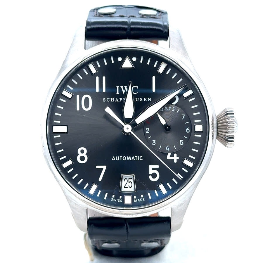18kt white gold case with a black leather strap. Fixed 18kt white gold bezel. Grey dial with silver-tone hands and Arabic numeral hour markers. Minute markers around the outer rim. Dial Type: Analog. Luminescent hands and markers. Date display at the 6 o'clock position. Automatic movement. Scratch resistant sapphire crystal. Screw down crown. Solid case back. Round case shape, case size: 46 mm, case thickness: 16 mm. Band width: 22 mm. Buckle clasp. Water resistant at 60 meters / 200 feet. Functions: power reserve, date, hour, minute, second. Big Pilot's Watch Series. Casual watch style. Watch label: Swiss Made. Pre-owned IWC Big PilotS Watch Automatic Grey Dial Men's Watch IW500402. GENERAL Collection Name: Big Pilot'S Watch INFORMATION Brand: IWC Series: Big Pilot'S Watch Model: IW500402 Gender: Mens Watch Label: Swiss Made Movement: Automatic CONDITION INFORMATION Box: No Preowned Item Condition: Excellent Papers: No CASE Case Thickness: 16 mm Case Material: 18kt White Gold Case Shape: Round Case Back: Solid DIAL Type: Analog Dial Color: Grey Crystal: Scratch Resistant Sapphire Hands: Silver-tone Second Markers: Minute Markers around the outer rim Dial Markers: Arabic Numeral Luminiscence: Hands and Markers Bezel: Fixed Bezel Material: 18kt White Gold Crown: Screw Down BAND Band Type: Strap Band Material: Leather Band Color: Black Band Width: 22 mm Clasp: Buckle FEATURES Water Resistance: 60 meters / 200 feet Calendar: Date display at the 6 o'clock position Functions: Power Reserve, Date, Hour, Minute, Second Watch Features: Analog, Gold, Leather ADDITIONAL INFO Watch Style: Casual Warranty: 1 Year Jomashop Warranty Jomashop Sku: PRE-P-IWC99486 Department: Watches