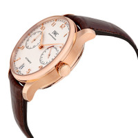 Pre-owned 18kt rose gold case with a dark brown (alligator) leather strap. Fixed 18kt rose gold bezel. White dial with rose gold leaf-style hands and Arabic numeral hour markers. Minute markers around the outer rim. Dial Type: Analog. Date display at the 6 o'clock position. Two sub-dials displaying: power reserve, and 60 seconds. IWC calibre 52010 automatic movement, containing 31 Jewels, composed of 257 parts, bitting at 28800 vph, and has a power reserve of approximately 168 hours. Scratch resistant sapphire crystal. Pull / push crown. Transparent case back. Round case shape. Case size: 42.3 mm. Case thickness: 14.5 mm. Tang clasp. Water resistant at 30 meters / 100 feet. Functions: hour, minute, small second, power reserve indicator. Portugieser Series. Luxury watch style. Watch label: Swiss Made. IWC Portugieser Automatic White Dial 18kt Rose Gold Men's Watch IW500701. GENERAL Preowned Item Condition: Excellent CASE Case Thickness: 14.5 mm Case Material: 18kt Rose Gold Case Shape: Round Case Back: Transparent BAND Band Material: (Alligator) Leather Band Type: Strap Band Color: Dark Brown Clasp: Tang DIAL Dial Color: White Type: Analog Crystal: Scratch Resistant Sapphire Hands: Rose Gold Leaf-style Dial Markers: Arabic Numeral Second Markers: Minute Markers around the outer rim Sub Dials: Two - Power Reserve and 60 Second Bezel: Fixed Bezel Material: 18kt Rose Gold Crown: Pull / Push INFORMATION Brand: IWC Series: Portugieser Collection Name: Portugieser Gender: Mens Model: IW500701 Watch Label: Swiss Made Movement: Automatic Engine: IWC Calibre 52010 Power Reserve: 168 hours FEATURES Water Resistance: 30 meters / 100 feet Calendar: Date display at the 6 o'clock position Functions: Hour, Minute, Small Second, Power Reserve Indicator Watch Features: Leather, Gold, Alligator Leather, Analog, Power Reserve Indicator ADDITIONAL INFO Watch Style: Luxury Warranty: 1 Year Jomashop Warranty UPC Code: 7613268456583 Jomashop Sku: PRE-P-IWC101472 Department: Watches Category: Watches