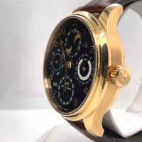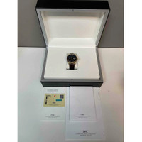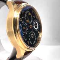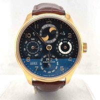 Pre-owned 18kt rose gold case. Matte brown alligator strap. Black dial with day/date/month/year displays. Moon phase display. Seven-day power reserve displays in small subdial. Convex sapphire crystal. Sapphire crystal caseback. Case diameter 44.2mm. Automatic movement. Water resistant at 30 meters (100 feet). IWC Portuguese Perpetual Calendar 18kt Rose Gold Brown Men's Watch IW502119 GENERAL Collection Name: Portuguese Perpetual Calendar INFORMATION Brand: IWC Series: Portuguese Perpetual Calendar Model: IW502119 Gender: Mens Watch Label: Swiss Made Movement: Automatic Engine: IWC Calibre 50612 Power Reserve: 168 hours CONDITION INFORMATION Box: Yes Preowned Item Condition: Excellent Papers: Yes CASE Case Size: 44.2 mm Case Thickness: 15.5 mm Case Material: 18kt Rose Gold Case Shape: Round Case Back: Transparent Exhibition Display DIAL Type: Analog Dial Color: Black Crystal: Scratch Resistant Sapphire Hands: Rose Gold Tone Dial Markers: Arabic Numeral Hour Markers, Minute Markers on the outer rim Sub Dials: Small Second and Day at 9, Perpetual Moon-phase at 12, Month at 6, Date and Power Reserve Indicator Bezel: Fixed Bezel Color: Rose Gold-tone Bezel Material: 18kt Rose Gold Crown: 18k Rose Gold, Fluted BAND Band Type: Strap Band Material: Leather Band Color: Brown FEATURES Water Resistance: 30 meters / 100 feet Calendar: Perpetual Calendar Functions: Year, Month, Day, Date, Hour, Minute, Second,Moonphase, Perpetual Calendar Watch Features: Alligator Leather, Analog, Power Reserve Indicator, Month, Perpetual, Gold, Moon Phase ADDITIONAL INFO Warranty: 1 Year Jomashop Warranty UPC Code: 7640127771693 Additional Info: Moon Phase Display; Day/Date/Month/Year Displays; 7-Day Power Reserve Displays in Small Subdial Jomashop Sku: PRE-P-IWC53106 Department: Watches Category: Watches