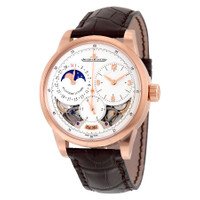 18kt pink gold case with a dark brown alligator leather strap. Fixed 18kt pink gold bezel. Silvered skeleton dial with pink gold-tone hands and Arabic numeral hour markers. Minute markers around the outer rim. Dial Type: Analog. Date. Three sub-dials displaying: time, date/moonphase, flying second (foudroyante). Jaeger LeCoultre Calibre JLC 381 Hand Wind movement, containing 40 Jewels, composed of 374 parts, bitting at 21600 vph, and has a power reserve of approximately 50 hours. Scratch resistant sapphire crystal. Pull / push crown. Transparent see through case back. Round case shape, case size: 42 mm, case thickness: 13.5 mm. Deployment clasp. Water resistant at 50 meters / 165 feet. Functions: moon phase, date, hour, minute, second, power reserve indicator, jumping seconds, foudroyante. Duometre Series. Luxury watch style. Watch label: Swiss Made. Item Variations: Q6042522, 6042522, 604.25.22, Q604.25.22. Jaeger Le Coultre Duometre Quantieme Lunaire 18ktPink Gold Men's Watch Q6042522. CASE Case Size: 42 Case Thickness: 13.5 mm Case Material: 18kt Pink Gold Case Shape: Round Case Back: Transparent See Through BAND Band Material: Alligator Leather Band Type: Strap Band Color: Dark Brown Clasp: Deployment DIAL Dial Color: Silvered Skeleton Type: Analog Crystal: Scratch Resistant Sapphire Hands: Pink Gold-tone Dial Markers: Arabic Numeral Second Markers: Minute Markers around the outer rim Sub Dials: Three - Time, Date/Moonphase, Flying Second (Foudroyante) Bezel: Fixed Bezel Material: 18kt Pink Gold Crown: Pull / Push INFORMATION Brand: Jaeger LeCoultre Series: Duometre Collection Name: Duometre Gender: Mens Model: Q6042522 Watch Label: Swiss Made Movement: Hand Wind Engine: Jaeger LeCoultre Calibre JLC 381 Power Reserve: 50 hours FEATURES Water Resistance: 50 meters / 165 feet Calendar: Date Functions: Moon Phase, Date, Hour, Minute, Second, Power Reserve Indicator, Jumping Seconds, Foudroyante Watch Features: Alligator Leather, Analog, Power Reserve Indicator, Gold, Leather, Moon Phase ADDITIONAL INFO Watch Style: Luxury Warranty: 2 Year Jomashop Warranty UPC Code: 7630007162130 Jomashop Sku: JLC-Q6042522 Item Variation: Q6042522, 6042522, 604.25.22, Q604.25.22 Department: Watches Category: Watches