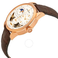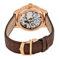 18kt rose gold case with a brown crocodile leather strap. Fixed 18kt rose gold bezel. Silver dial with rose gold-tone hands and index hour markers. Minute markers around the outer rim. Dial Type: Analog. Date display between 9 and 10 o'clock position. Three sub-dials displaying: small hour/minute, date/moonphase, flying second (foudroyante). Jaeger LeCoultre Calibre JLC 381 Hand Wind movement, containing 40 Jewels, composed of 374 parts, bitting at 21600 vph, and has a power reserve of approximately 50 hours. Scratch resistant sapphire crystal. Transparent case back. Round case shape, case size: 42 mm, case thickness: 13 mm. Deployment with push button release clasp. Water resistant at 50 meters / 165 feet. Functions: moon phase, date, hour, minute, second, power reserve indicator, jumping seconds, foudroyante. Duometre Quantieme Lunaire Series. Luxury watch style. Watch label: Swiss Made. Jaeger LeCoultre Duometre Quantieme Lunaire Men's Watch Q6042422. CASE Case Size: 42 Case Thickness: 13 mm Case Material: 18kt Rose Gold Case Shape: Round Case Back: Transparent BAND Band Material: Crocodile Leather Band Type: Strap Band Color: Brown Clasp: Deployment with Push Button Release DIAL Dial Color: Silver Type: Analog Crystal: Scratch Resistant Sapphire Hands: Rose Gold-tone Dial Markers: Index Second Markers: Minute Markers around the outer rim Sub Dials: Three - Small Hour/Minute, Date/Moonphase, Flying Second (Foudroyante) Bezel: Fixed Bezel Material: 18kt Rose Gold INFORMATION Brand: Jaeger LeCoultre Series: Duometre Quantieme Lunaire Collection Name: Duometre Quantieme Lunaire Gender: Mens Model: Q6042422 Watch Label: Swiss Made Movement: Hand Wind Engine: Jaeger LeCoultre Calibre JLC 381 Power Reserve: 50 hours FEATURES Water Resistance: 50 meters / 165 feet Calendar: Date display between 9 and 10 o'clock position Functions: Moon Phase, Date, Hour, Minute, Second, Power Reserve Indicator, Jumping Seconds, Foudroyante Watch Features: Moon Phase, Leather, Gold, Power Reserve Indicator, Analog ADDITIONAL INFO Watch Style: Luxury Warranty: 2 Year Jomashop Warranty UPC Code: 7630007187591 Jomashop Sku: JLC-Q6042422 Department: Watches Category: Watches