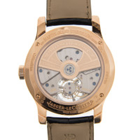 18kt rose gold case with a black alligator leather strap. Fixed 18kt rose gold bezel. Multi-color dial with gold-tone alpha-style shape hands and index hour markers. Minute markers. date scale around the outer rim, home and travel time zones. Dial Type: Analog. One subdial displaying: tourbillon. Jaeger LeCoultre Calibre JLC 978 Automatic movement, containing 33 Jewels, composed of 302 parts, bitting at 28800 vph, and has a power reserve of approximately 48 hours. Scratch resistant sapphire crystal. Pull / push crown. Transparent case back. Round case shape, case size: 42 mm, case thickness: 13 mm. Band width: 21-18 mm. Fold over clasp. Water resistant at 50 meters / 165 feet. Functions: tourbillon, hour, minute, second. Master Grand Tradition A Tourbillon 42 Series. Luxury watch style. Watch label: Swiss Made. Jaeger LeCoultre Master Grand Tradition A Tourbillon 42 Automatic Men's Watch Q1652424. CASE Case Size: 42 Case Thickness: 13 mm Case Material: 18kt Rose Gold Case Shape: Round Case Back: Transparent BAND Band Material: Alligator Leather Band Type: Strap Band Color: Black Band Width: 21-18 mm Clasp: Fold Over DIAL Dial Color: Multi-color Type: Analog Crystal: Scratch Resistant Sapphire Hands: Gold-tone Alpha-style shape Dial Markers: Index Second Markers: Minute Markers. Date Scale around the outer rim, home and travel time zones Sub Dials: One - Tourbillon Bezel: Fixed Bezel Material: 18kt Rose Gold Crown: Pull / Push INFORMATION Brand: Jaeger LeCoultre Series: Master Grand Tradition A Tourbillon 42 Collection Name: Master Grand Tradition A Tourbillon 42 Gender: Mens Model: Q1652424 Watch Label: Swiss Made Movement: Automatic Engine: Jaeger LeCoultre Calibre JLC 978 Power Reserve: 48 hours FEATURES Water Resistance: 50 meters / 165 feet Functions: Tourbillon, Hour, Minute, Second Watch Features: Alligator Leather, Analog, Gold, Leather, Tourbillon, Time Zone ADDITIONAL INFO Watch Style: Luxury Warranty: 2 Year Jomashop Warranty Jomashop Sku: JLC-Q1652424 Department: Watches Category: Watches